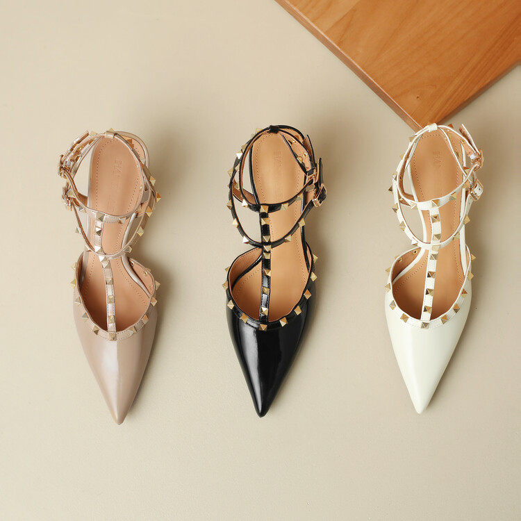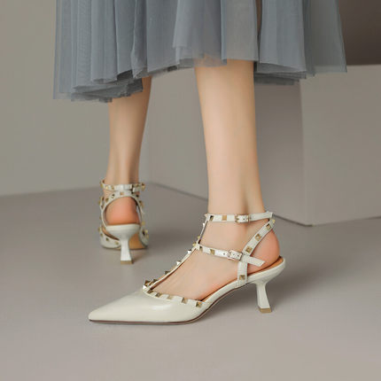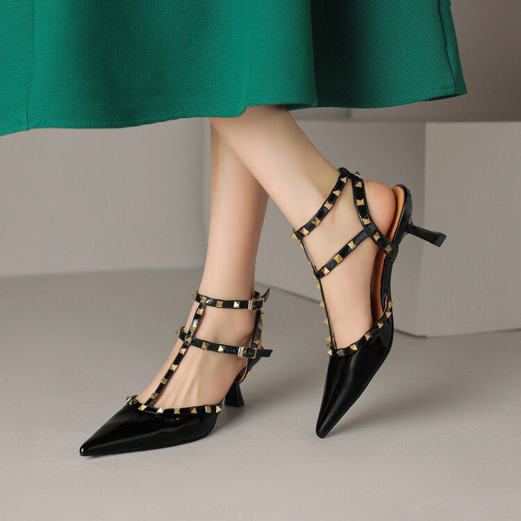 韩版时尚铆钉牛漆皮尖头高跟鞋气质性感包头后空细跟凉鞋女3340码