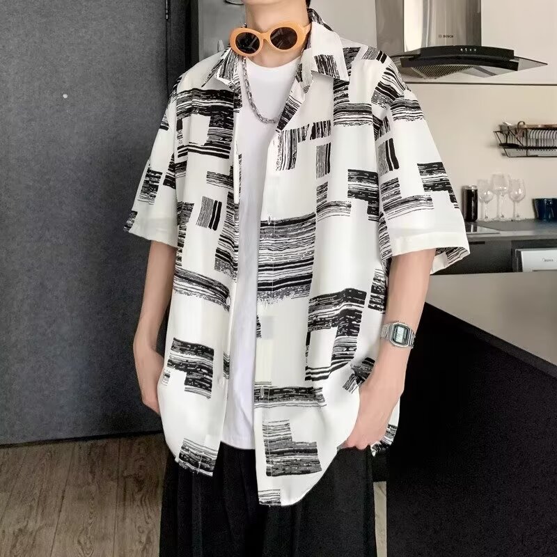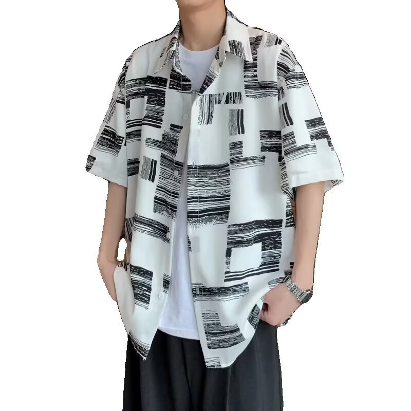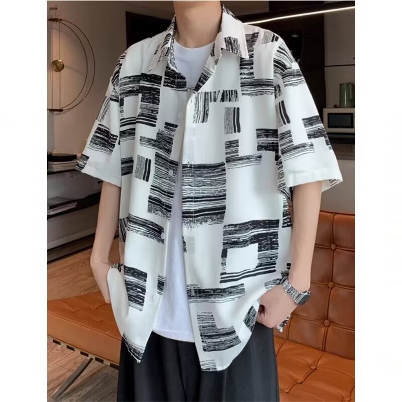 夏季潮流轻薄款条纹短袖衬衫男潮牌复古宽松大码痞帅沙滩半袖衬衣