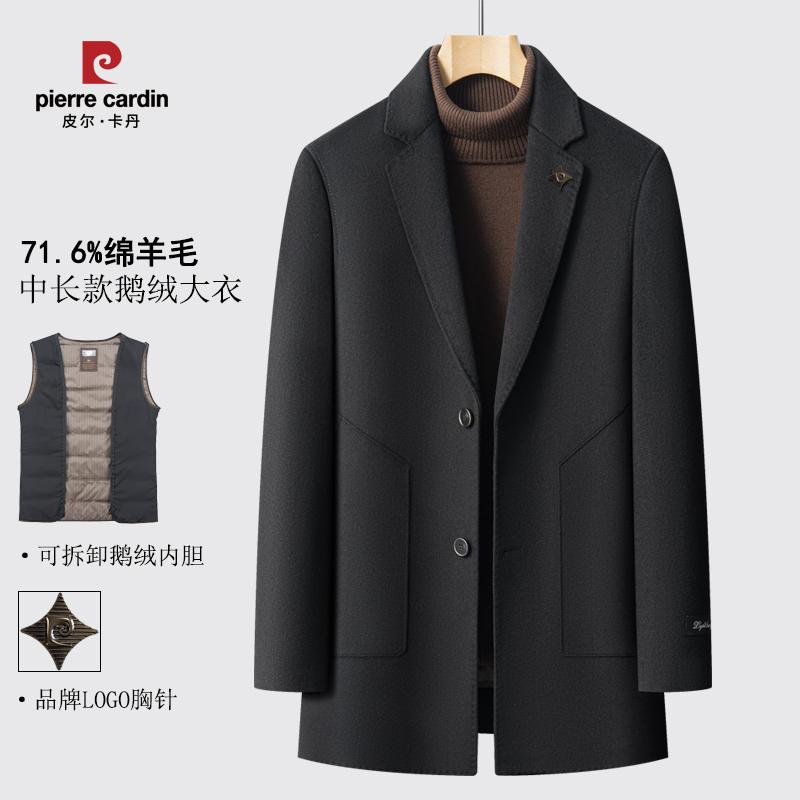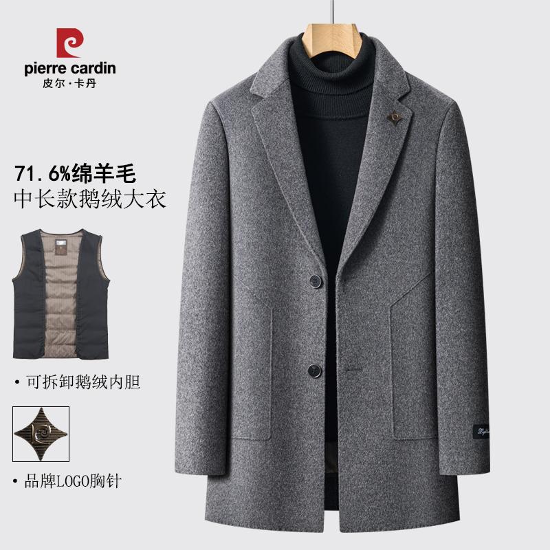 皮尔卡丹男士中长款羊毛大衣秋冬季羽绒内胆西装领双面呢保暖外套