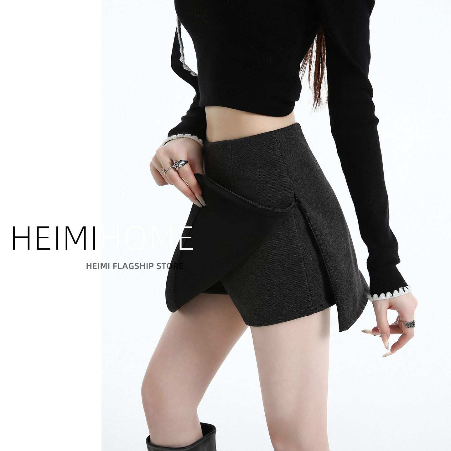 黑色毛呢短裙裤女秋冬季高级感侧开叉半身裙小个子气质A字包臀裙