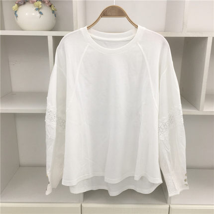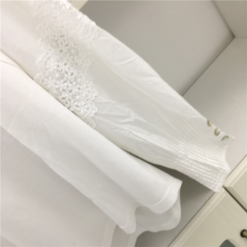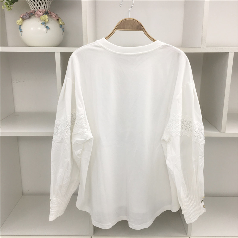 圆领刺绣蕾丝花长袖白色衬衫T恤