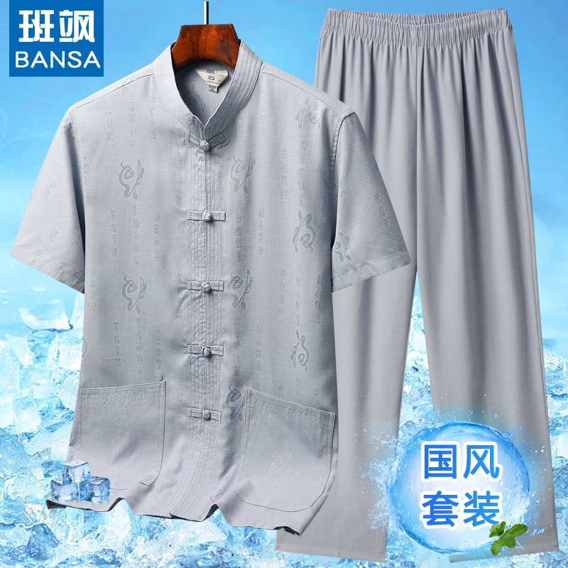 薄款夏季国风唐装套装爷爷装中老年男人爸爸装太极休闲短袖两件套
