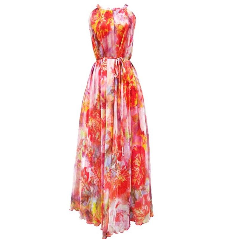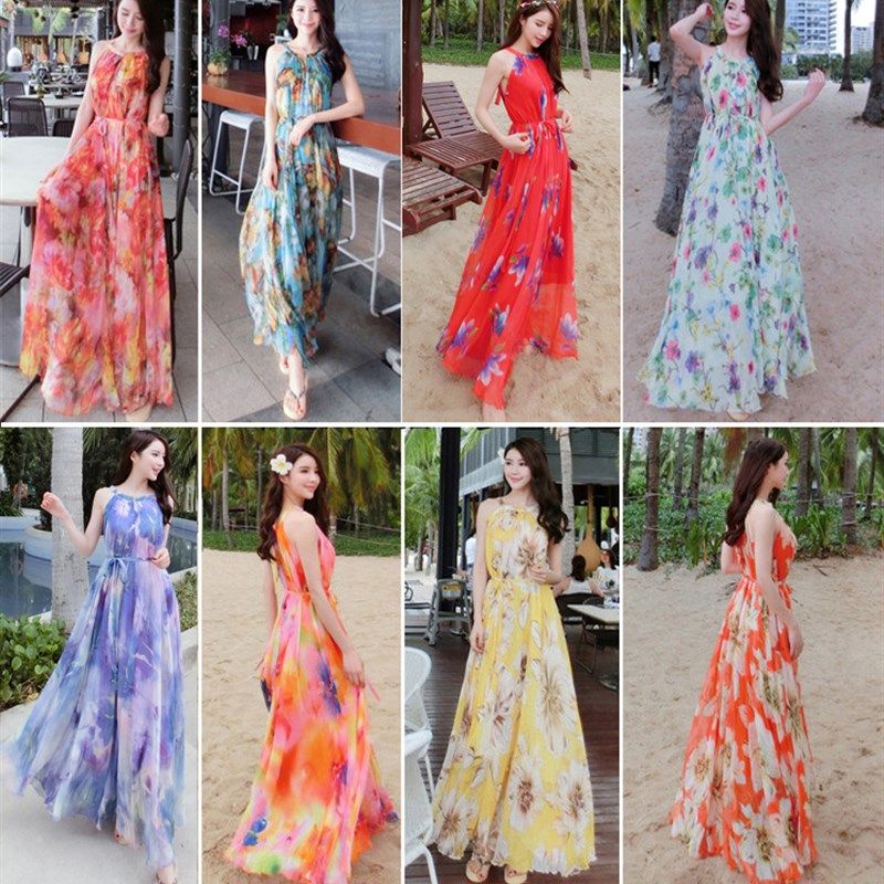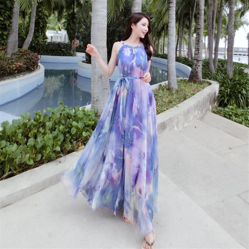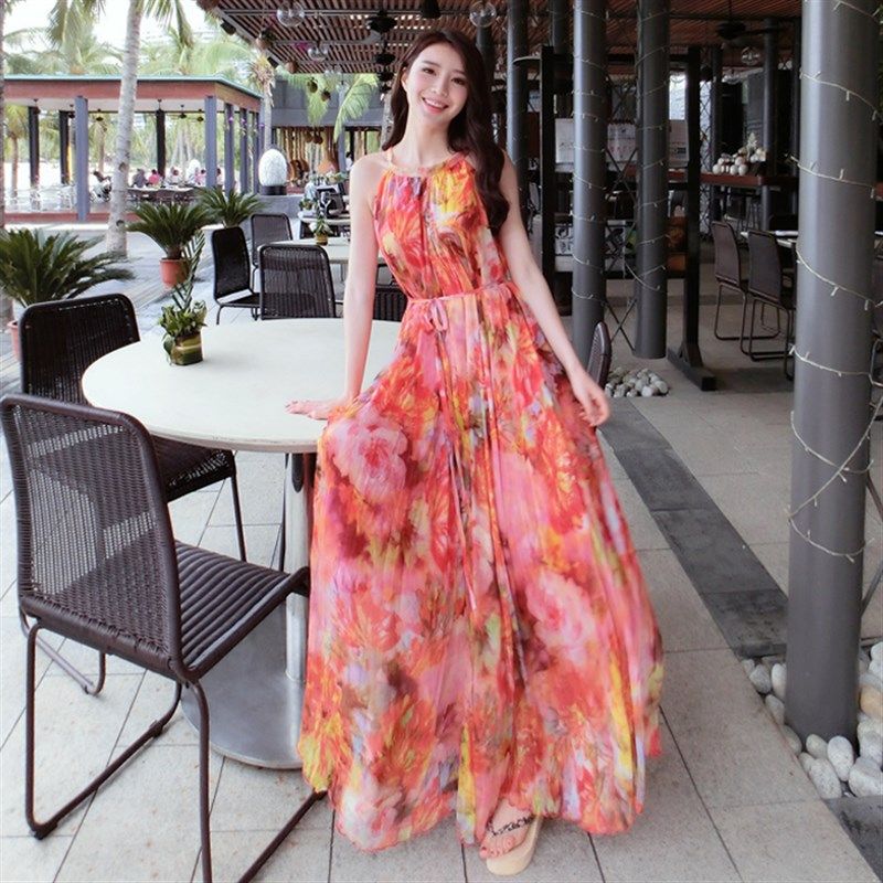 新款吊带碎花雪纺连衣裙大码长款波西米亚度假沙滩裙挂脖长裙