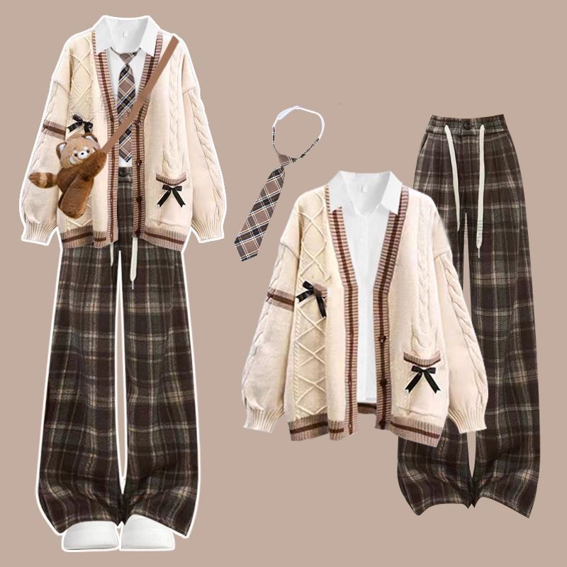 秋冬季韩系穿搭一整套慵懒风小个子毛衣外套衬衫休闲裤三件套装女