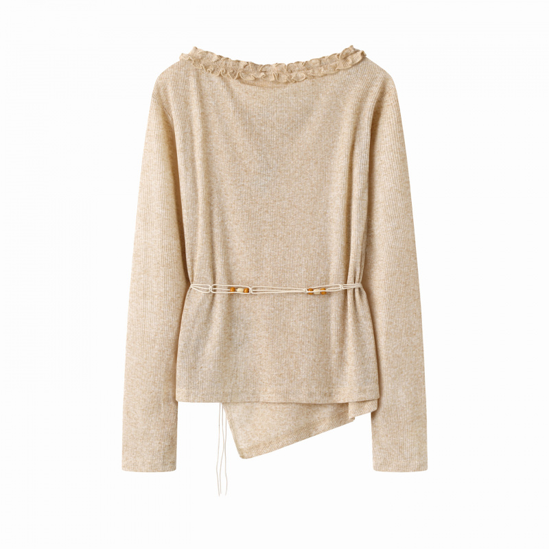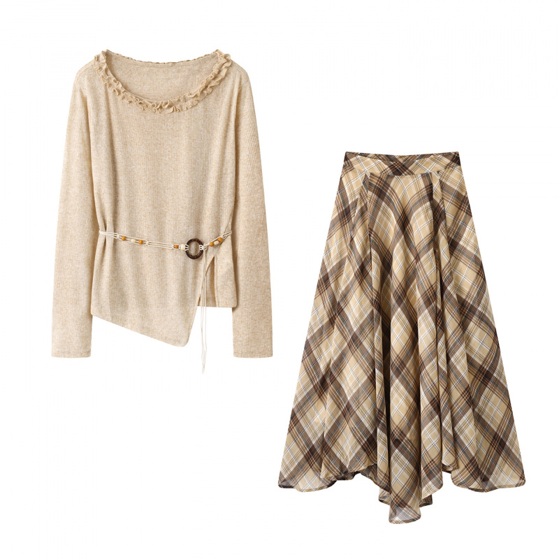 2025秋季新款波西米亚腰带木耳边杏色针织衫侧开叉薄款上衣半身裙