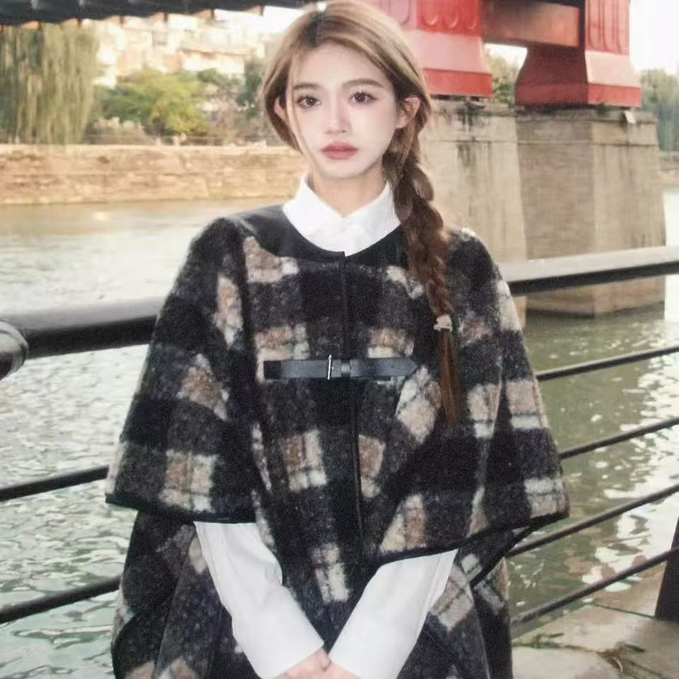 美拉德穿搭复古设计感外搭格纹拼接斗篷流苏披肩针织衫外套女2025