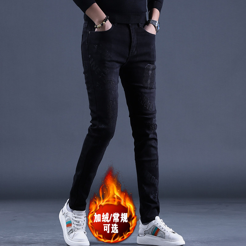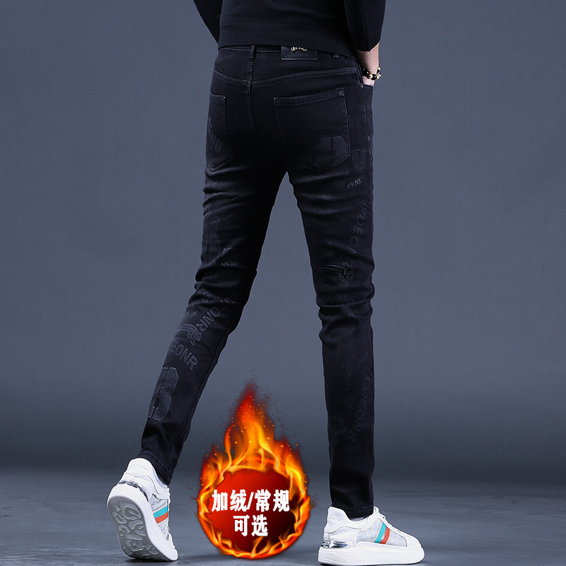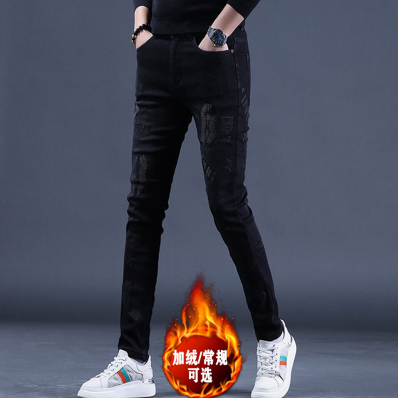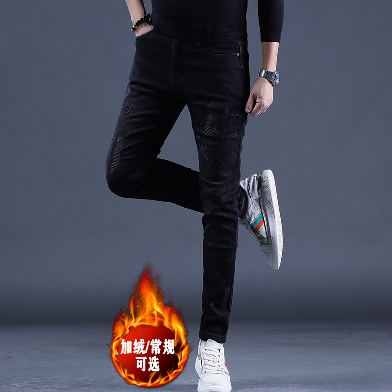 秋冬款黑色款男士加绒保暖刺绣牛仔裤男新款修身小脚休闲男裤子潮