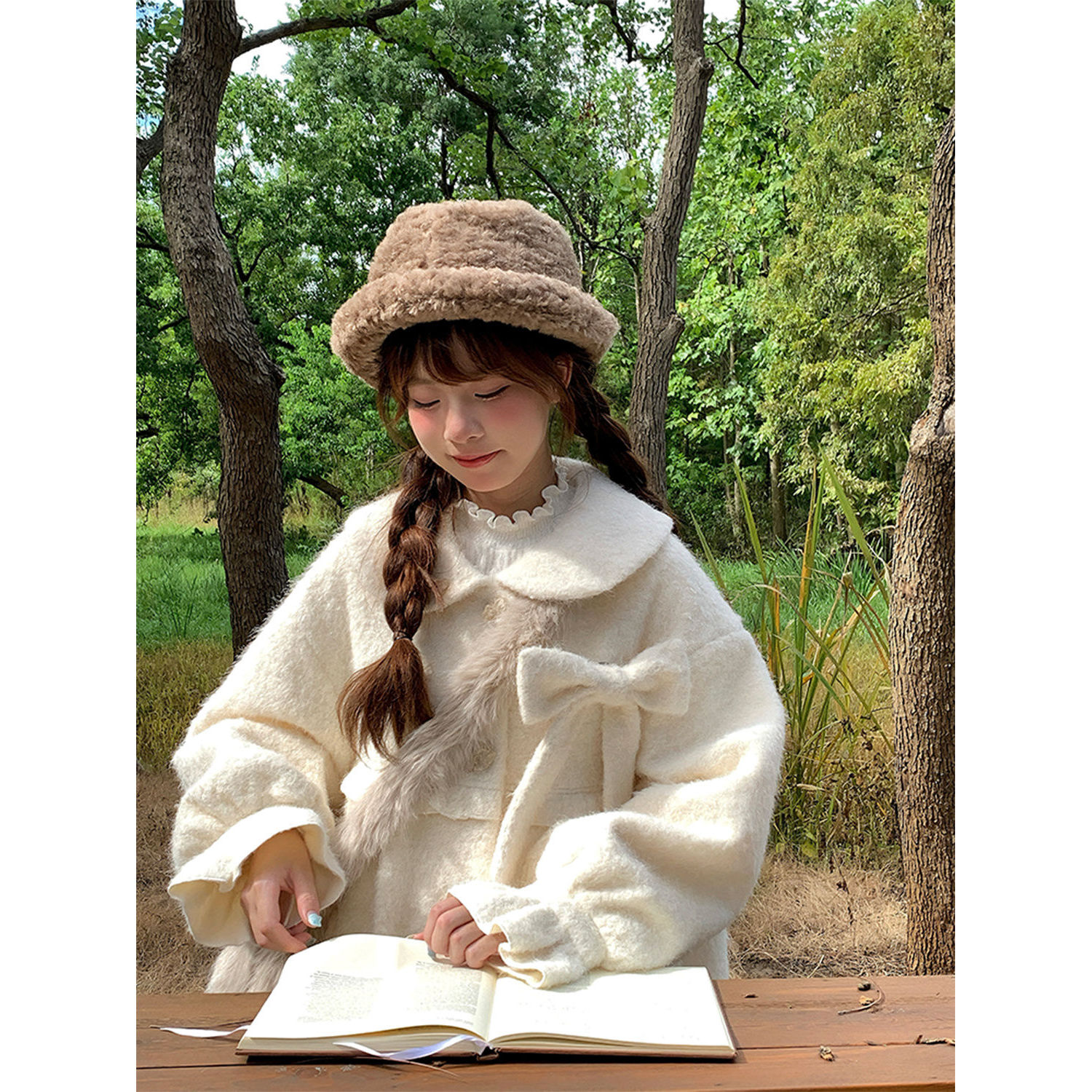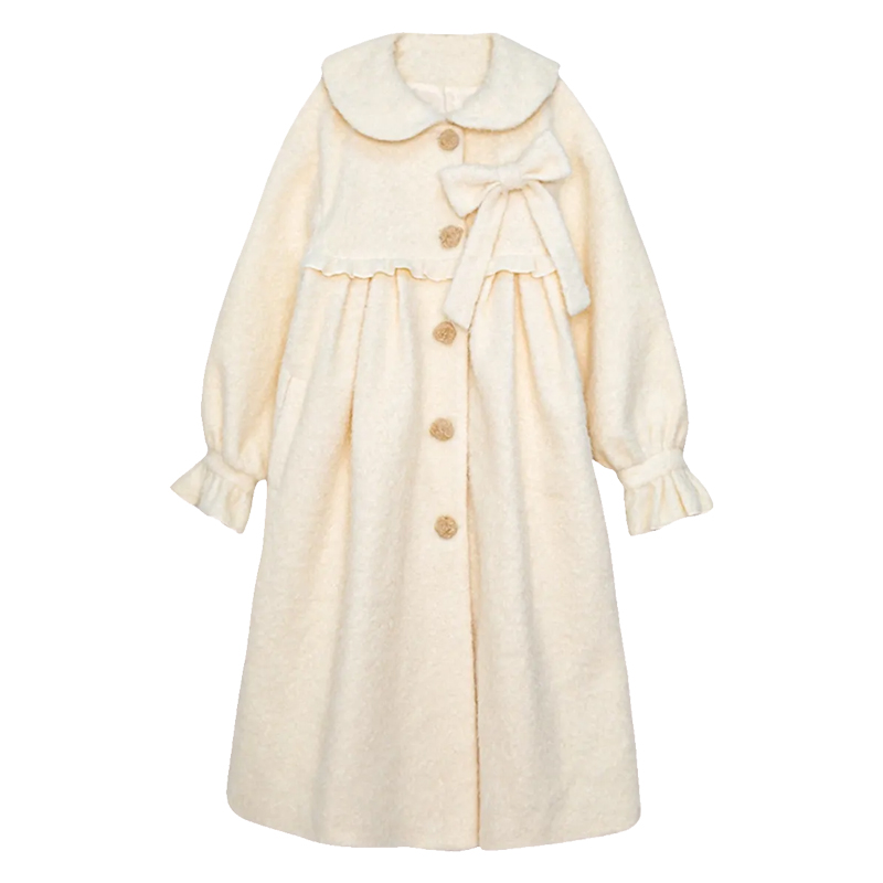 软妹蝴蝶结娃娃领白色毛呢大衣冬甜美少女日系学院风可爱加厚外套