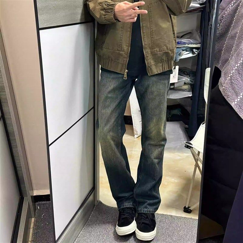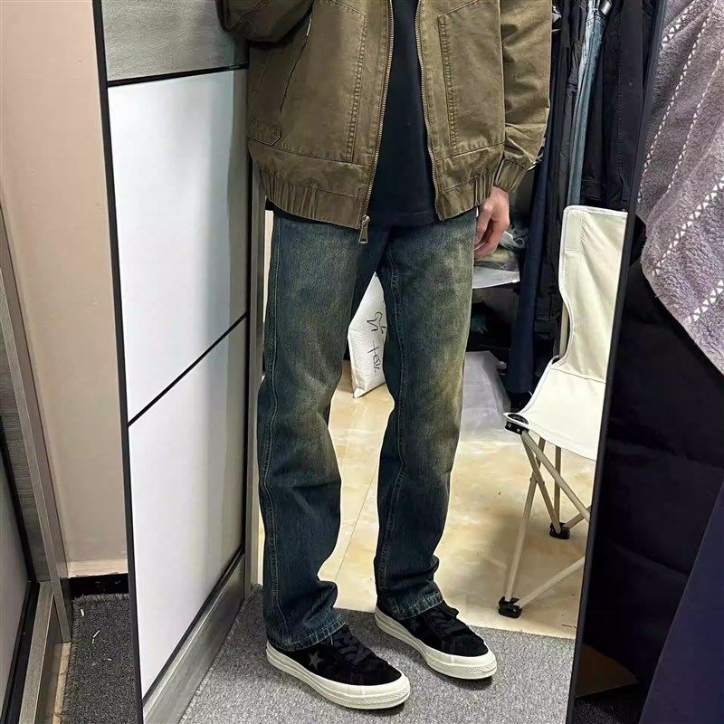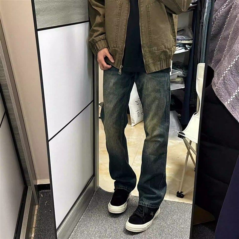 复古深色修身小脚牛仔裤男直筒裤子紧身显瘦百搭重工水洗休闲潮流