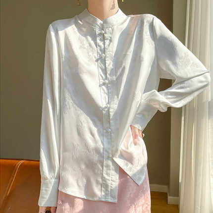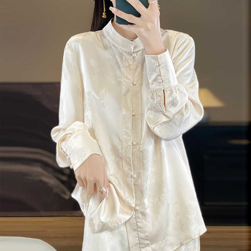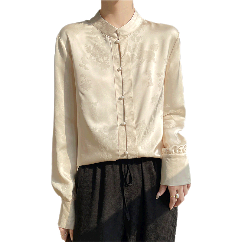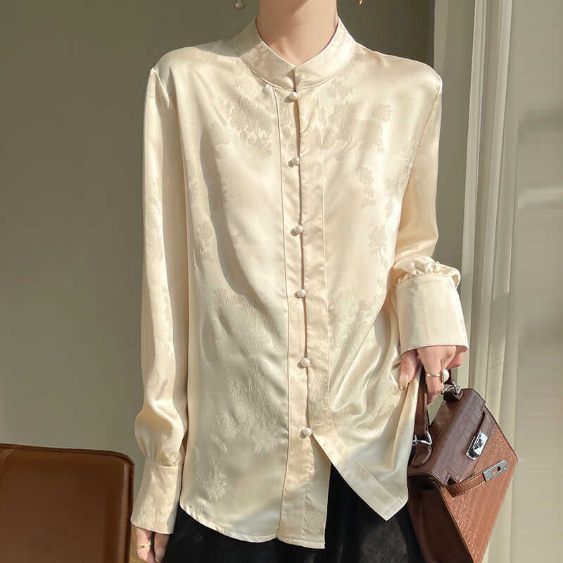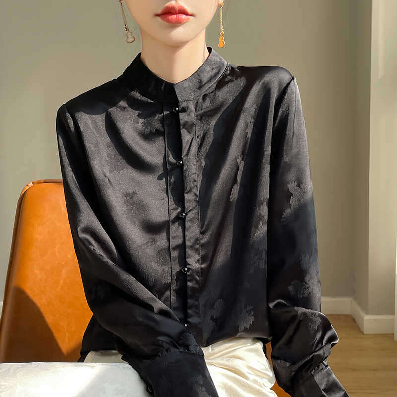 立领新中式长袖奢华衬衫女提花高级感古风上衣缎面新款薄款25衬衣