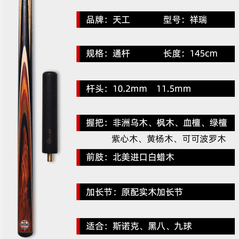 天工台球杆祥瑞小头杆中式黑八黑8球杆英式斯诺克桌球杆一体通杆