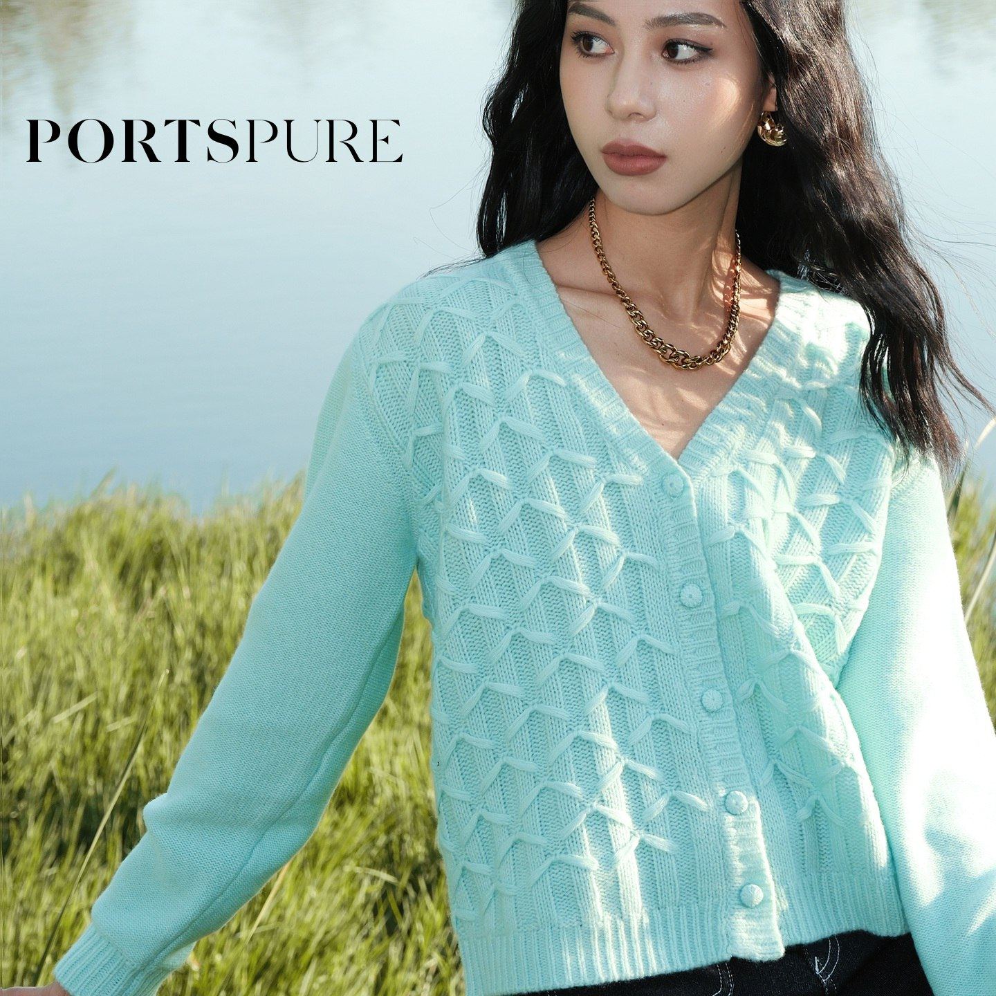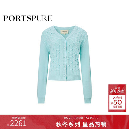 商场同款 宝姿PORTSPURE女装2025秋冬新品温柔V领菱格针织开衫
