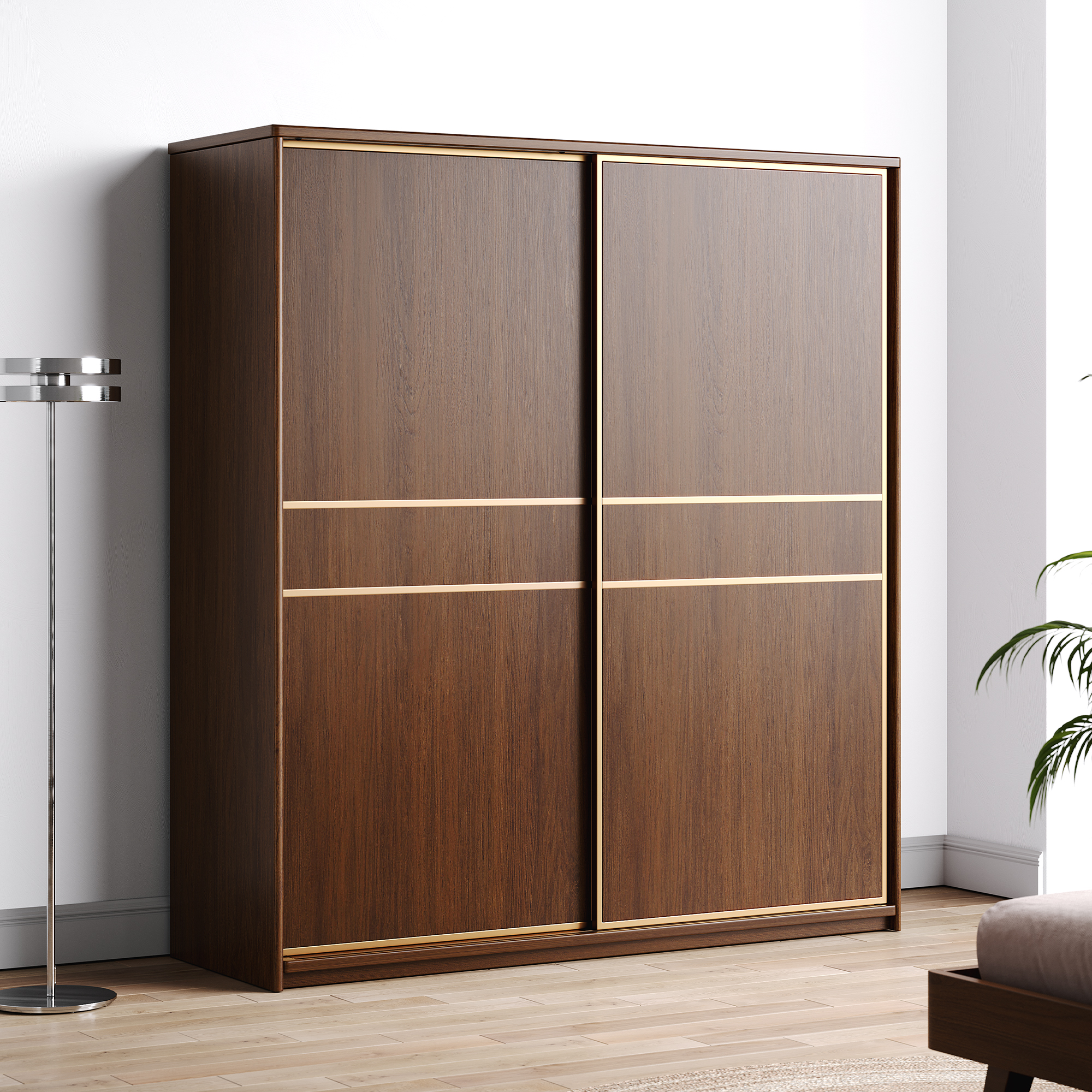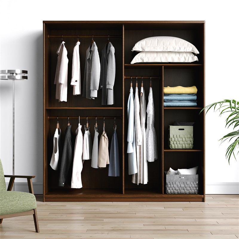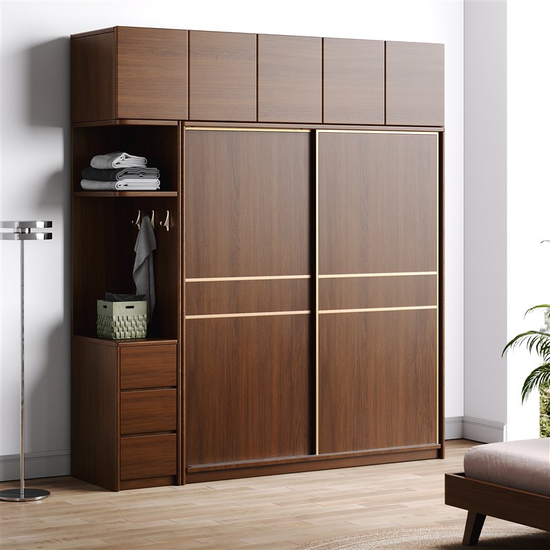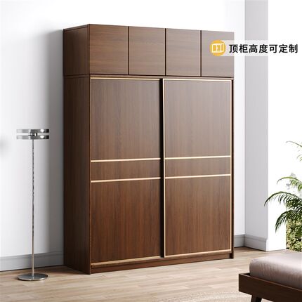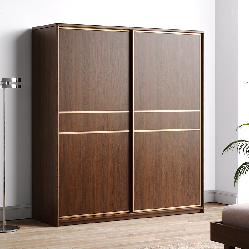 全实木橡木推拉门家m用卧室衣柜胡桃色简约现代风大衣橱移门挂衣