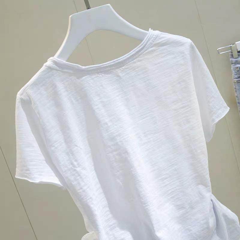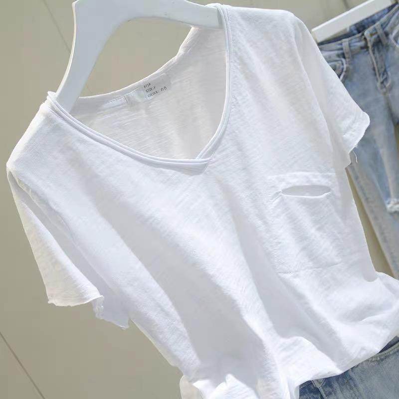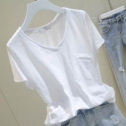 短袖t恤女v领竹节棉半袖上衣白色宽松显瘦大码休闲打底衫夏季新款
