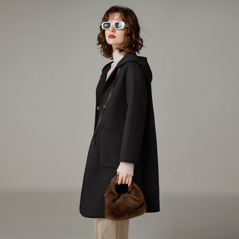 白鹿语连帽羊毛混纺双面呢冬款时尚优雅气质落肩中长款外套女