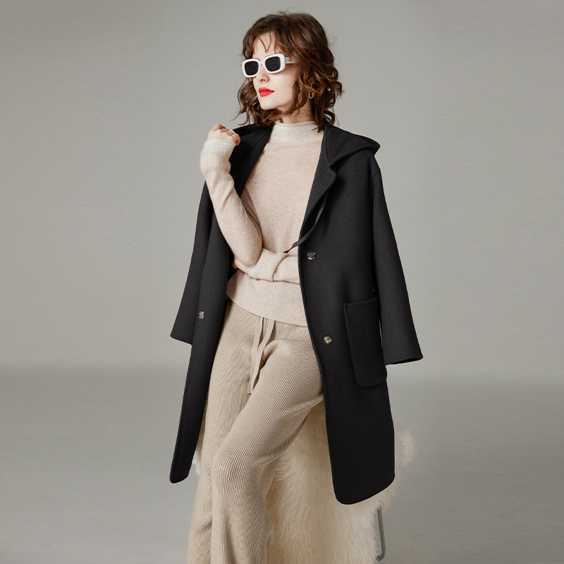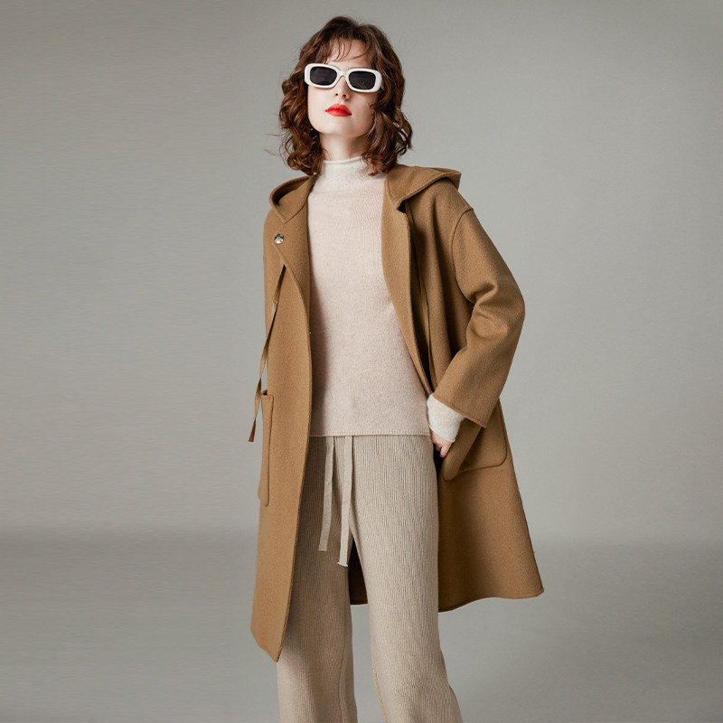 白鹿语中长通勤连帽双面呢大衣