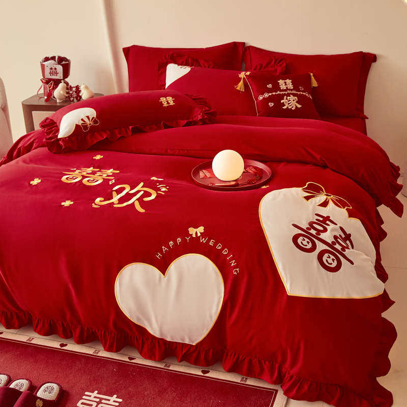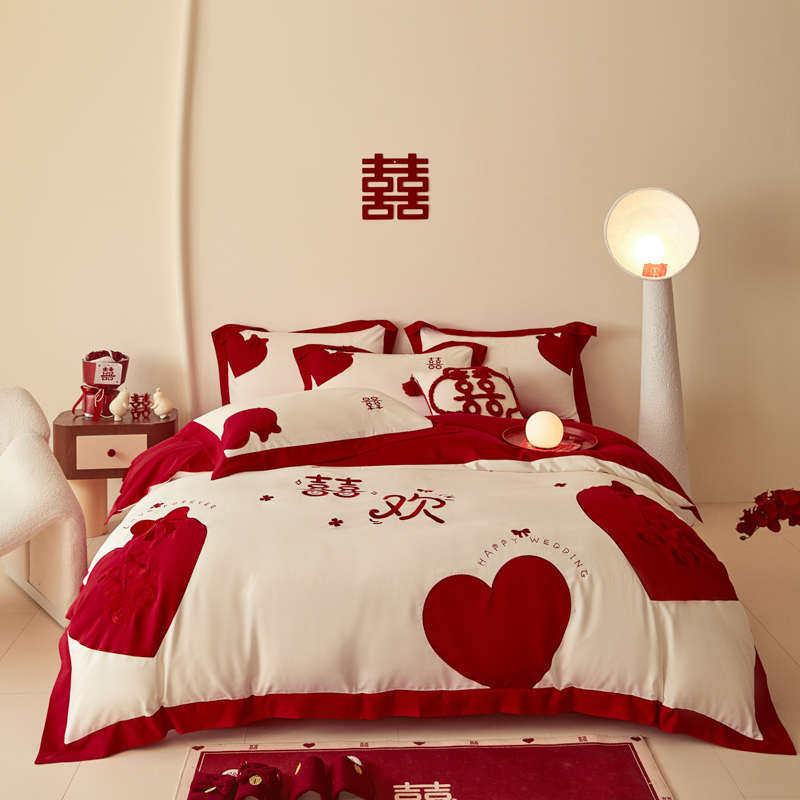 结婚四件套喜庆全棉贴布绣纯棉床单被罩婚房婚嫁红色床上用品