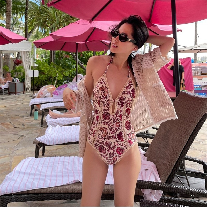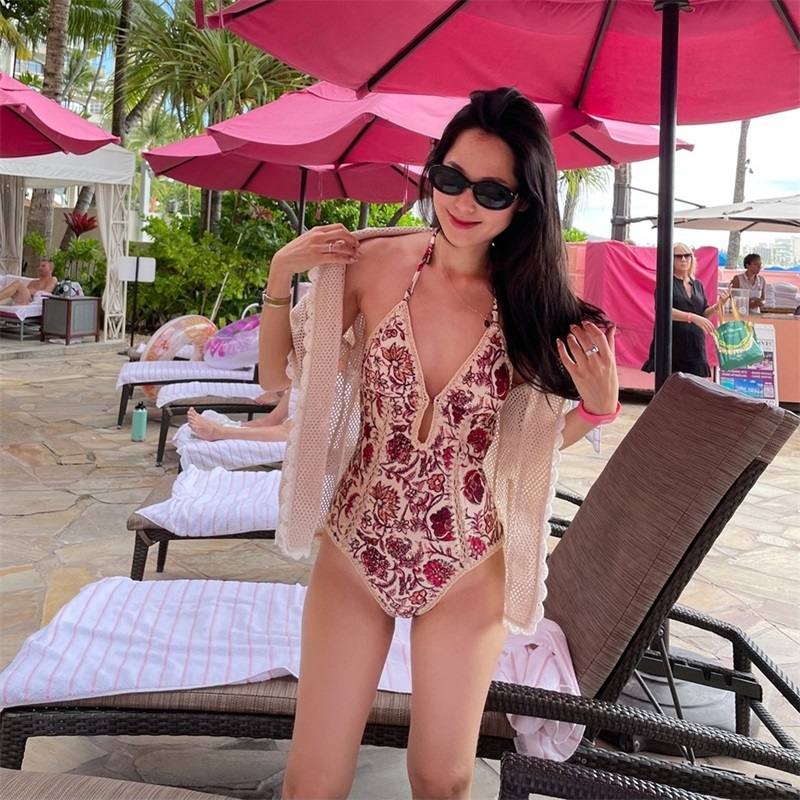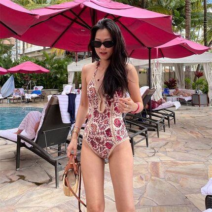 澳洲小众轻奢印花挂脖连体小胸聚拢遮肚显瘦温泉度假海边游泳衣女