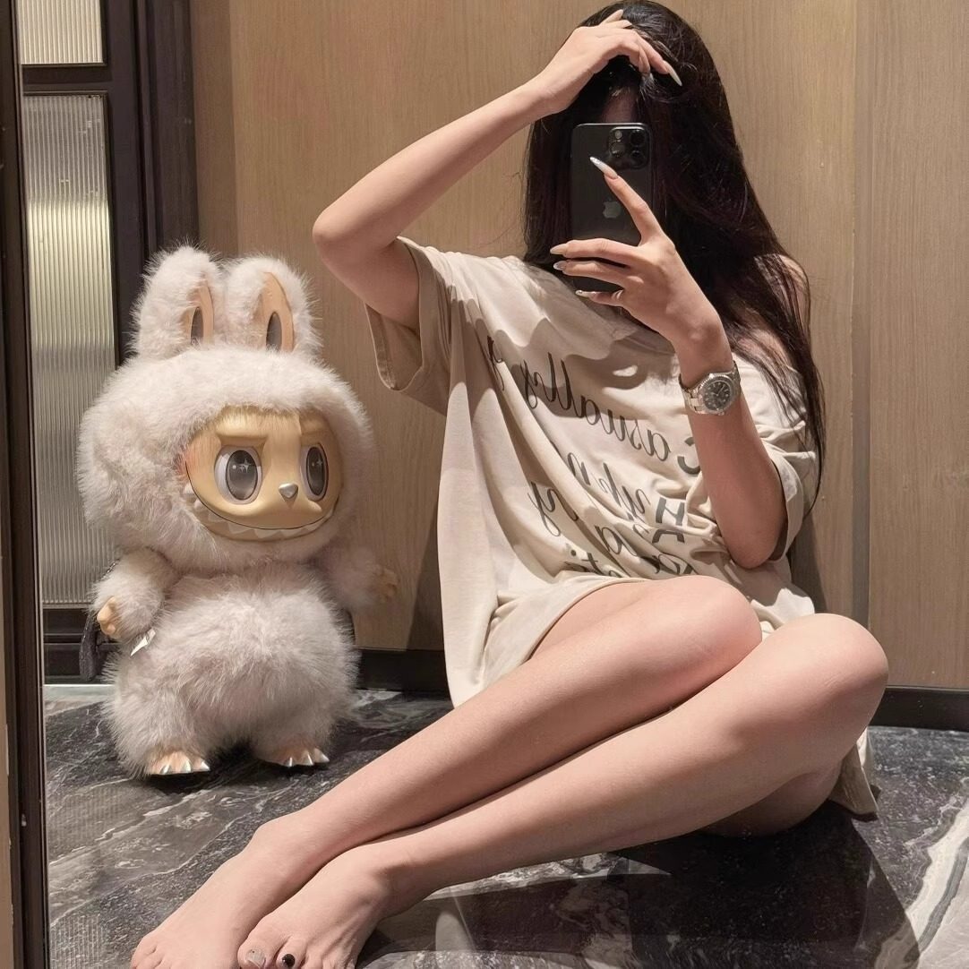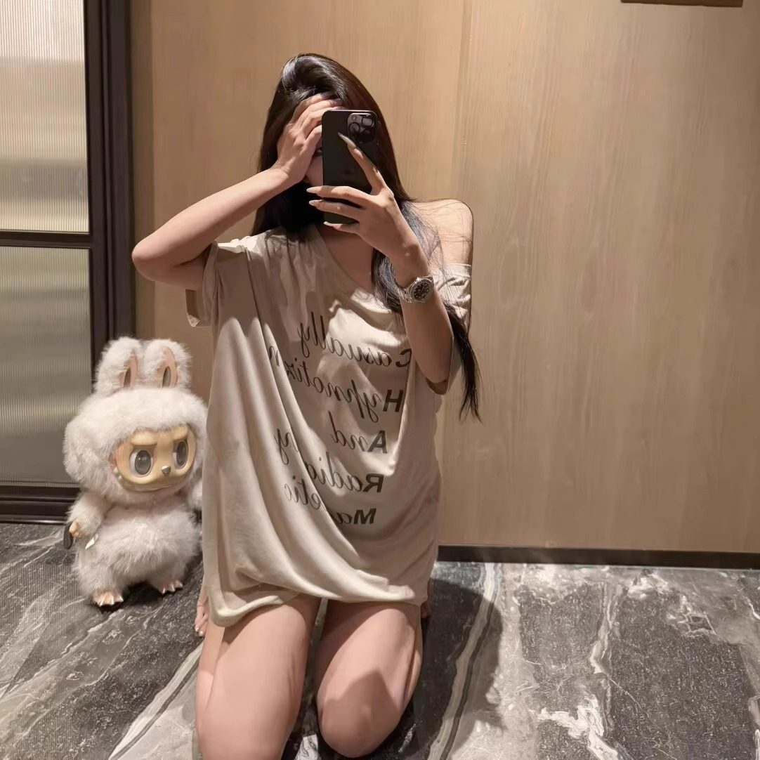 美式简约字母印花斜肩短袖T恤女夏季微透松弛感罩衫双面穿上衣潮