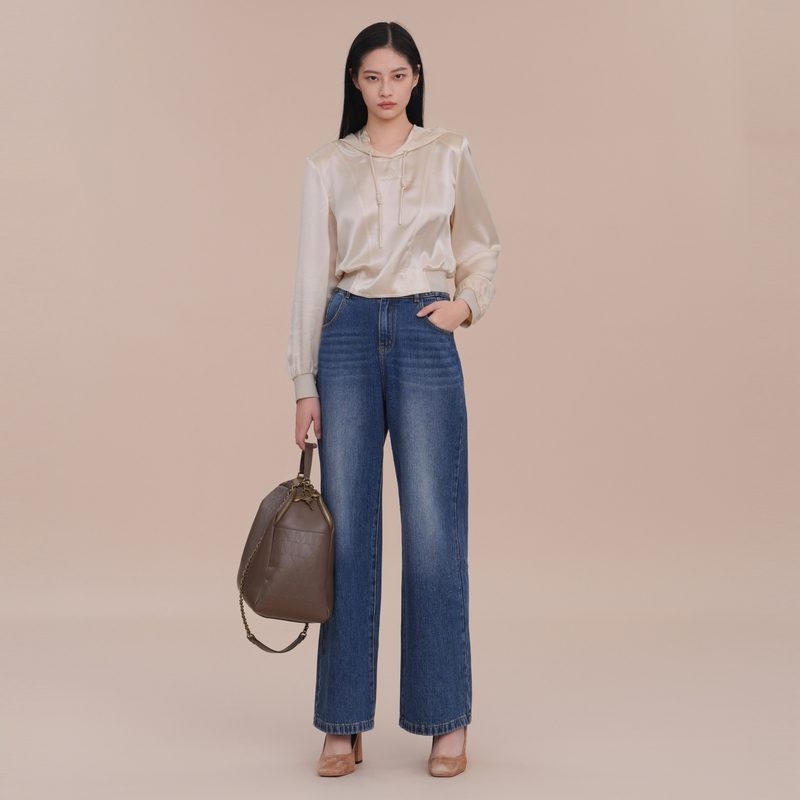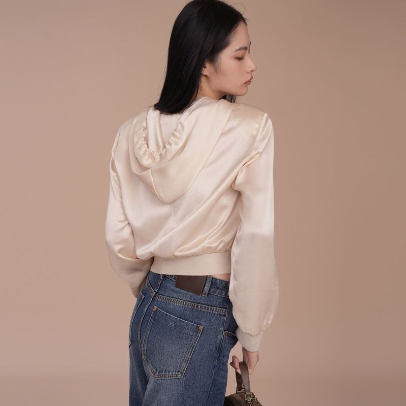 XG雪歌印花设计通勤长袖衬衫2025春季新款米白色休闲连帽上衣女装
