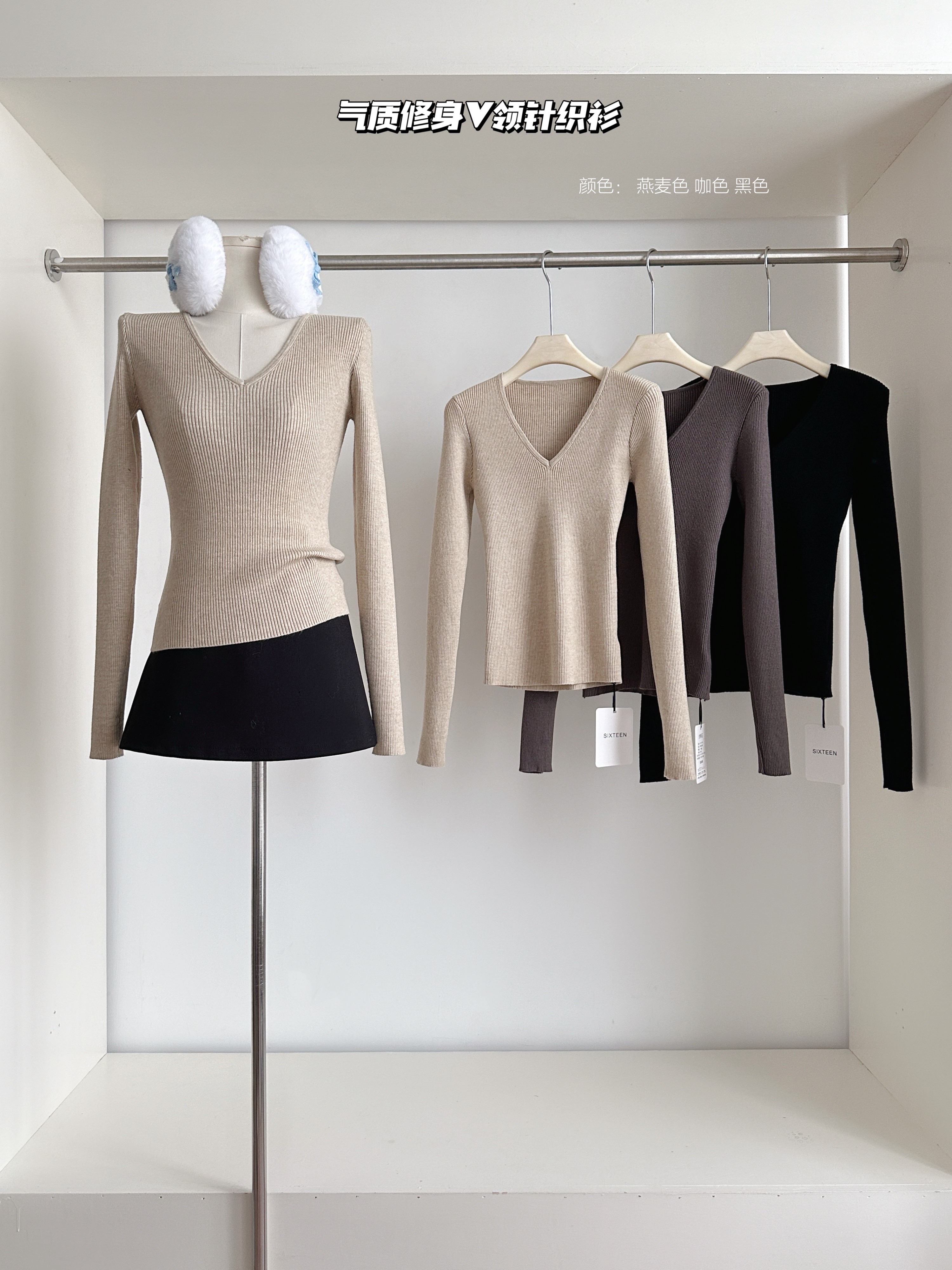 韩系氛围感通勤纯色基础V领针织打底衫女秋冬内搭修身长袖上衣潮