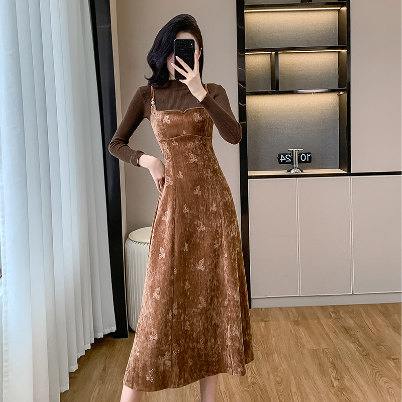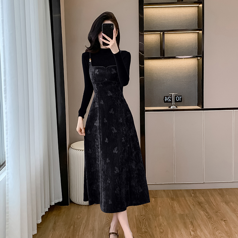 2025秋冬法式复古丝绒连衣裙内搭吊带裙毛衣两件套