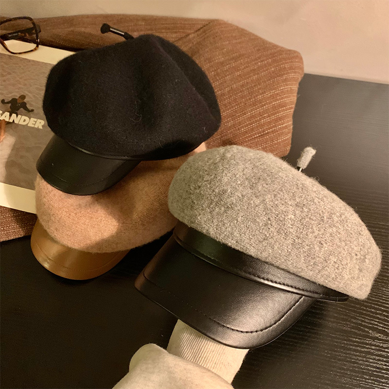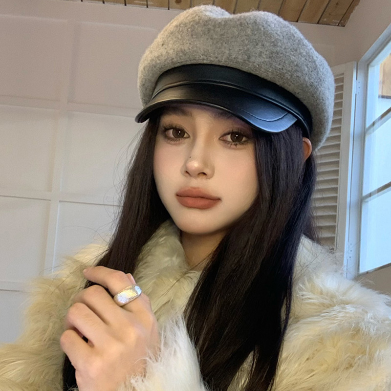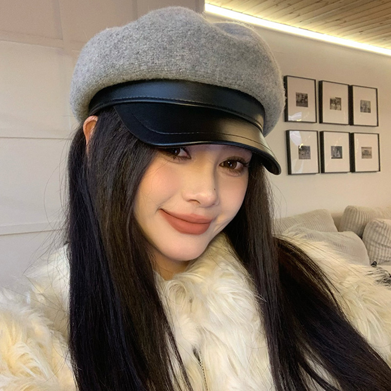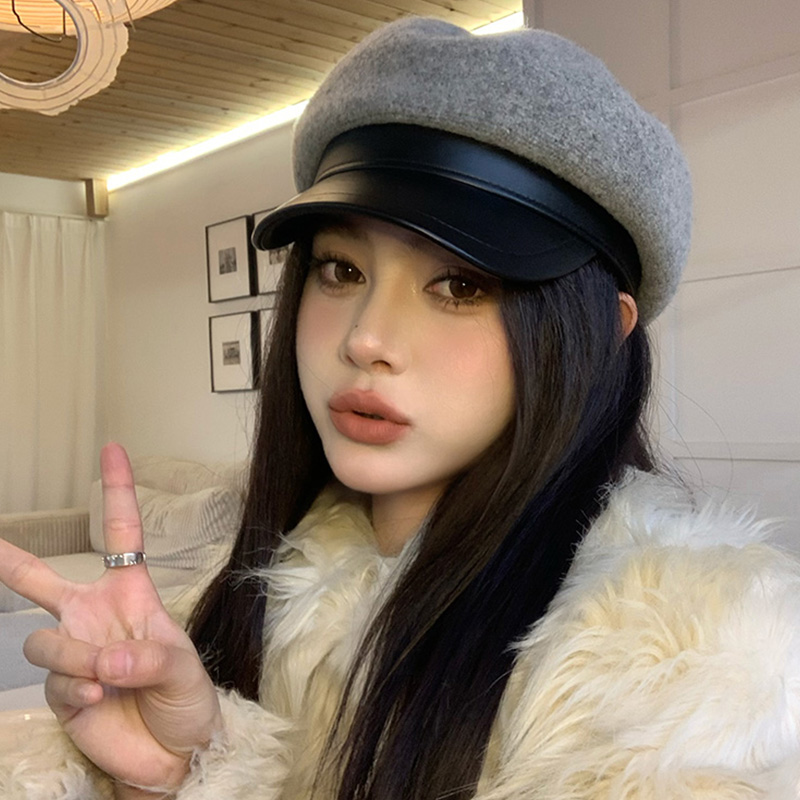 PU皮帽檐灰色八角帽子女2025年秋冬季羊毛呢鸭舌贝雷帽百搭报童帽