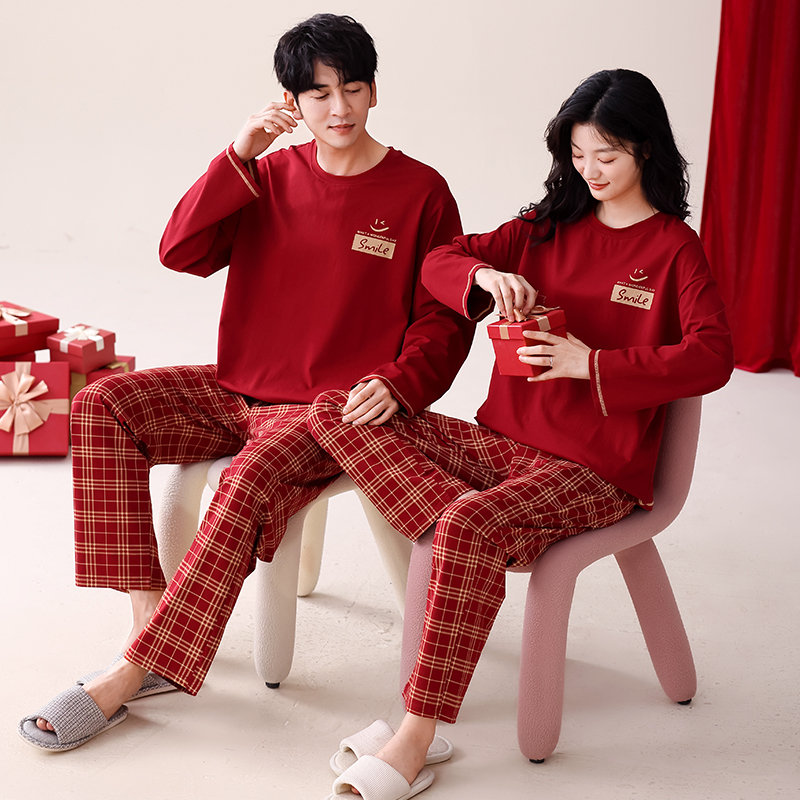 情侣睡衣女春秋款纯棉长袖套装男秋冬季结婚新婚红色本命年家居服