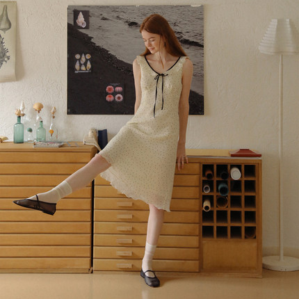 LLANO植绒波点v领连衣裙复古优雅荷叶边法式无袖气质中长裙女夏季