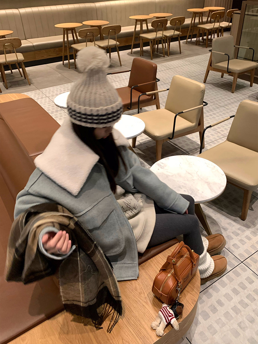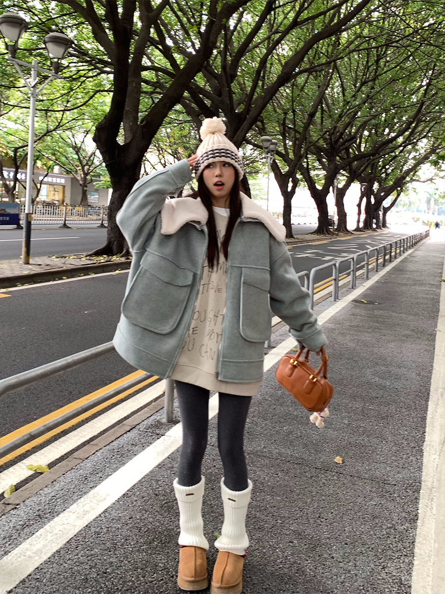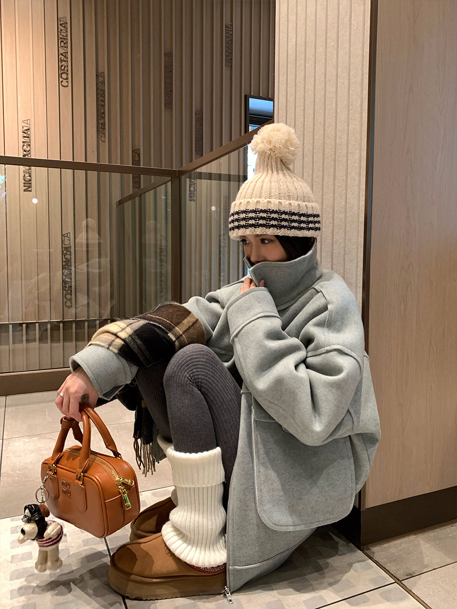 荒荒家宽松翻领呢子棉服秋冬新款休闲保暖拉链大口袋毛领棉衣外套