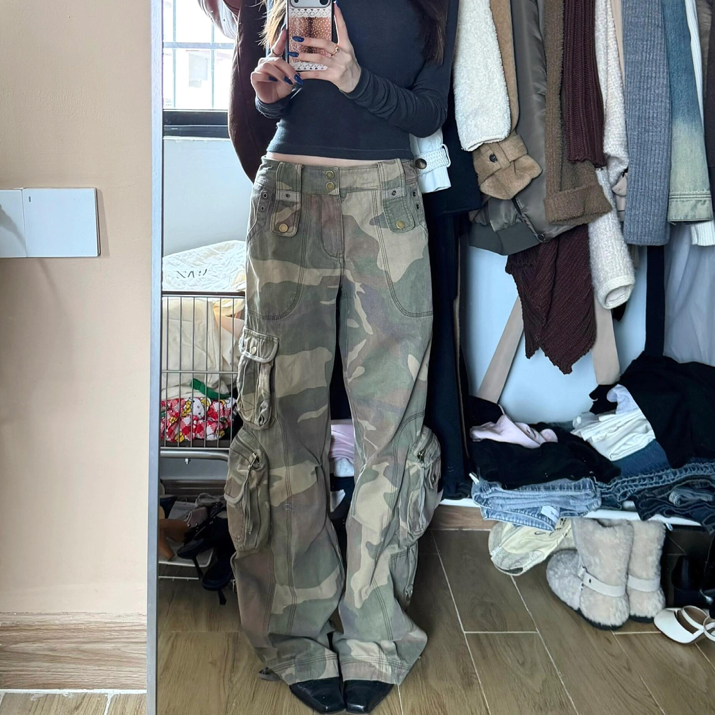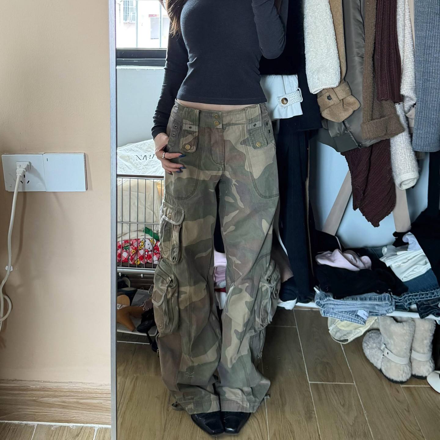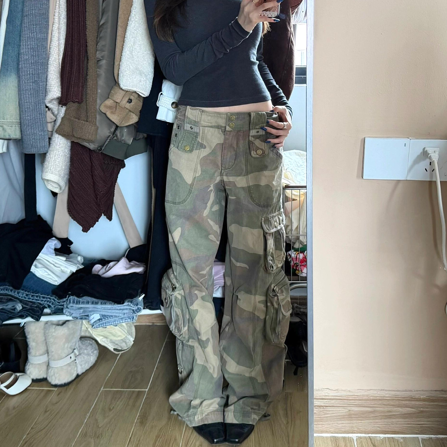 复古迷彩工装阔腿显瘦牛仔裤
