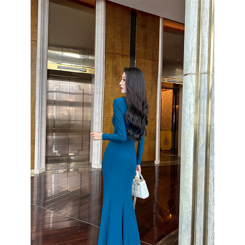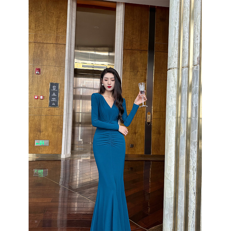 YOUKEFEIER高定水晶麻气质名媛纯色优雅轻奢连衣裙V领性感鱼尾裙