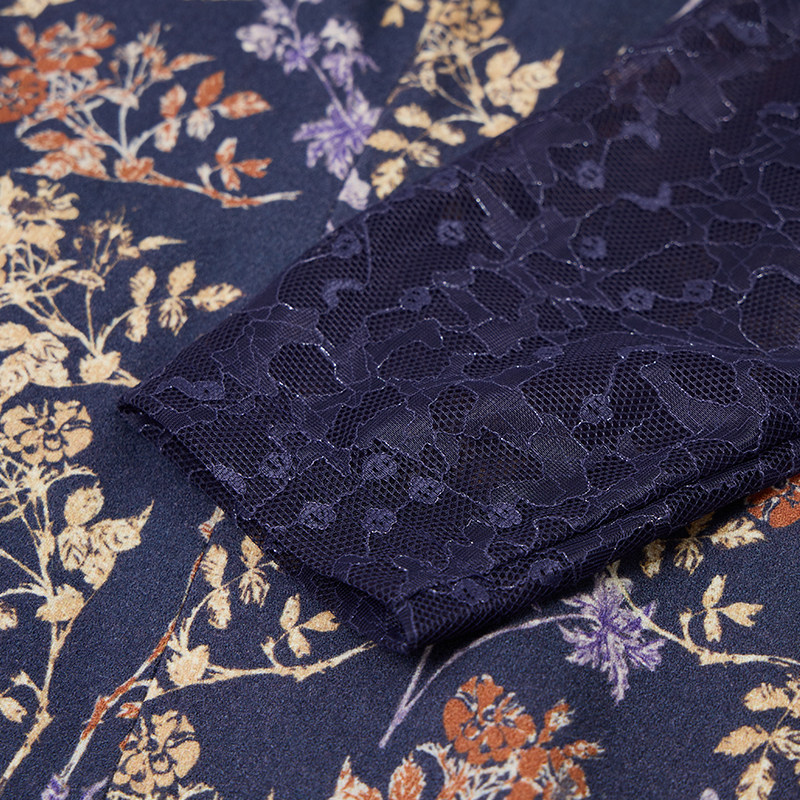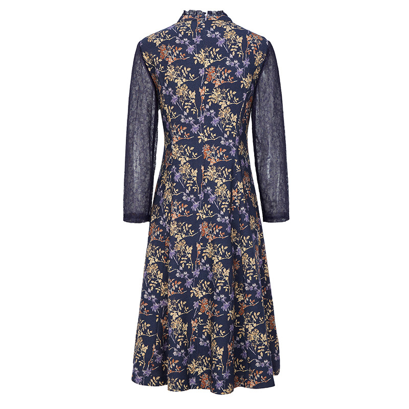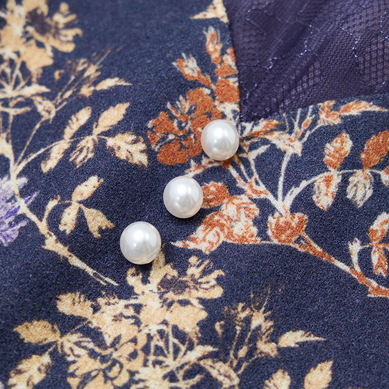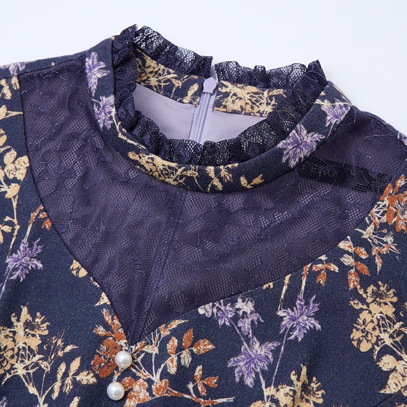 马天奴秋冬女装紫色印花立领收腰连衣裙子拼接蕾丝长袖时尚