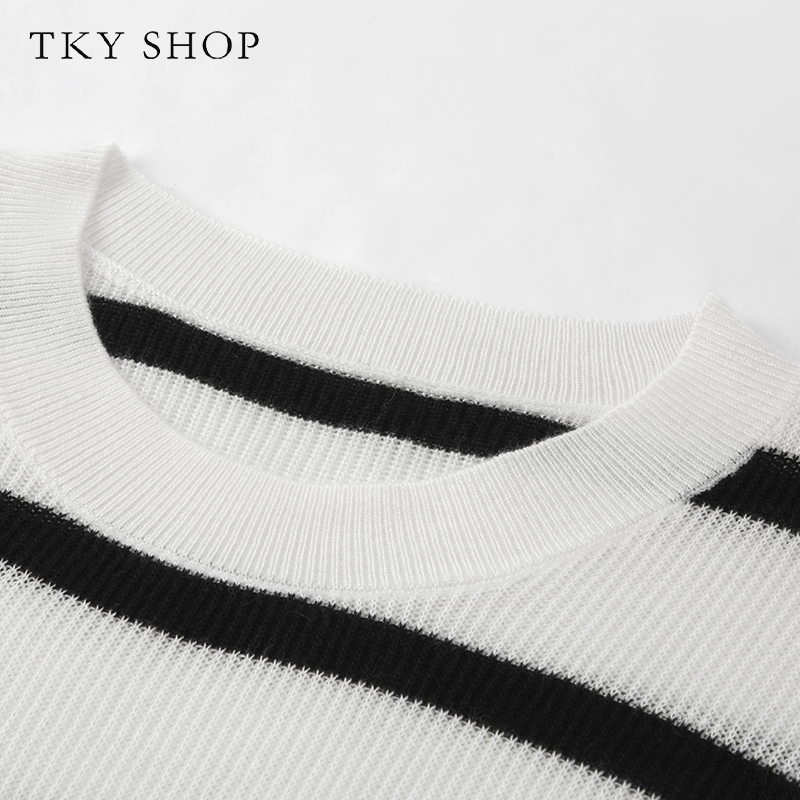 TKY SHOP圆领黑白条纹短袖针织衫女秋季宽松简约打底衫休闲薄上衣