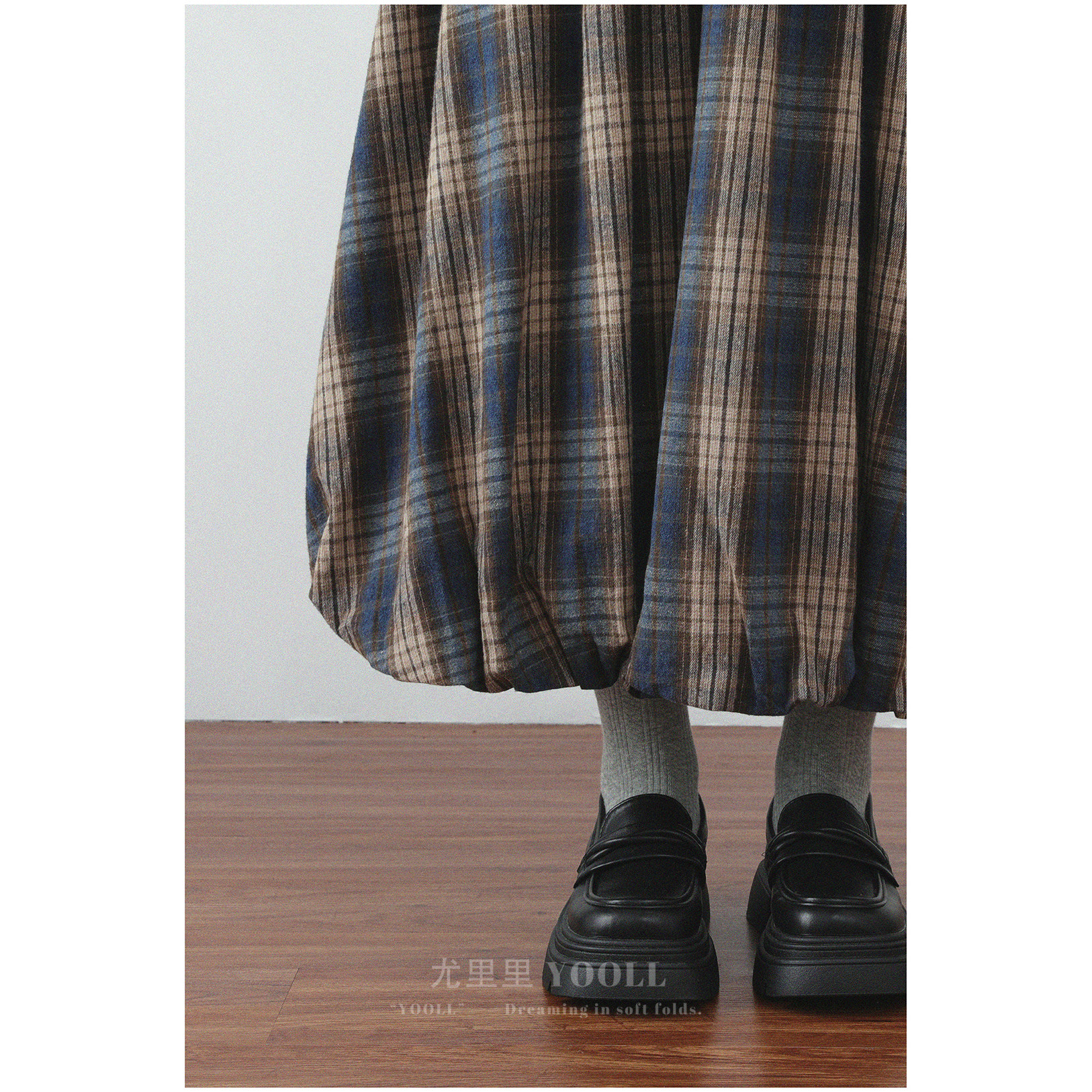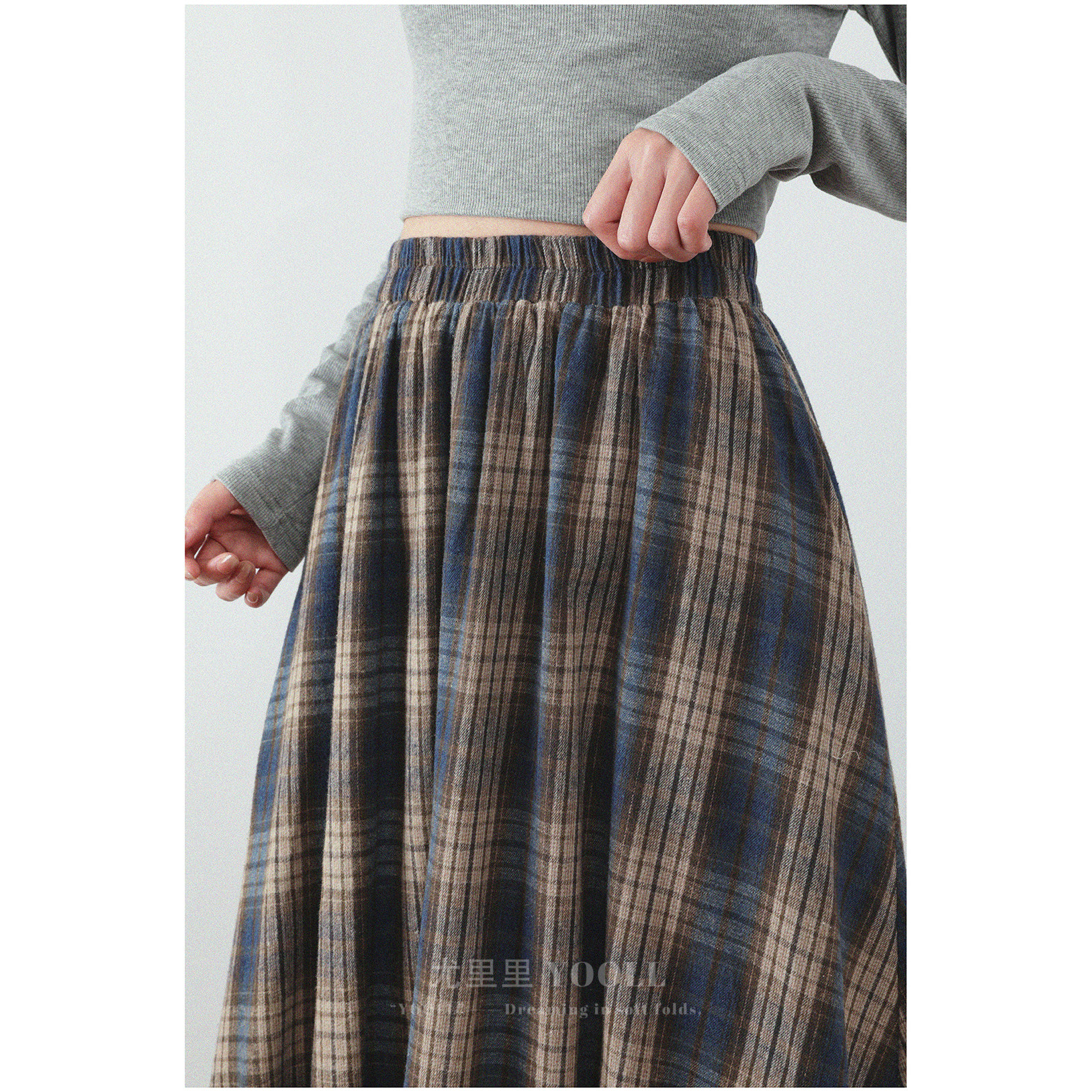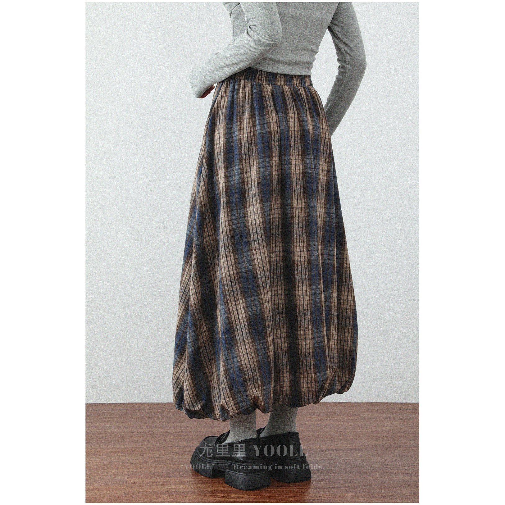磨毛棉感柔软蓬蓬立体花苞裙春秋新款拼色格纹松紧高腰显瘦半身裙