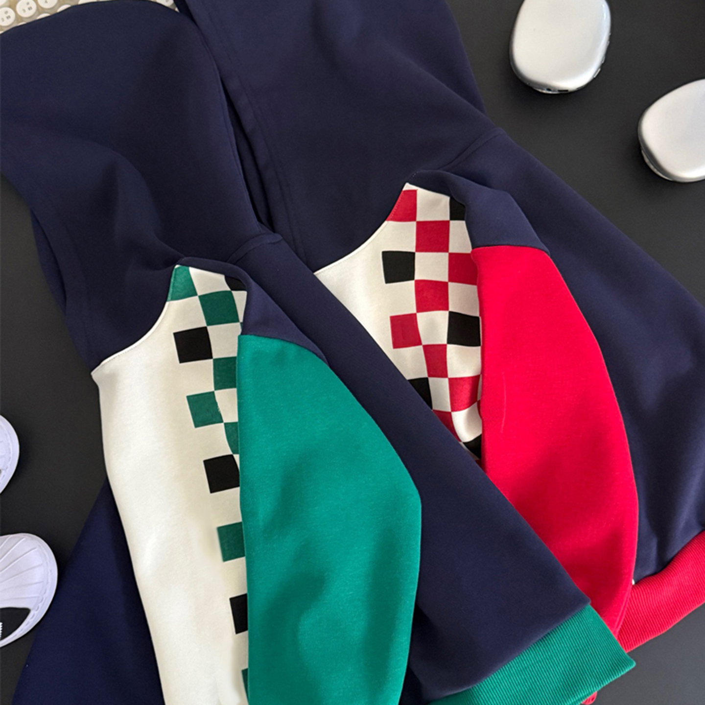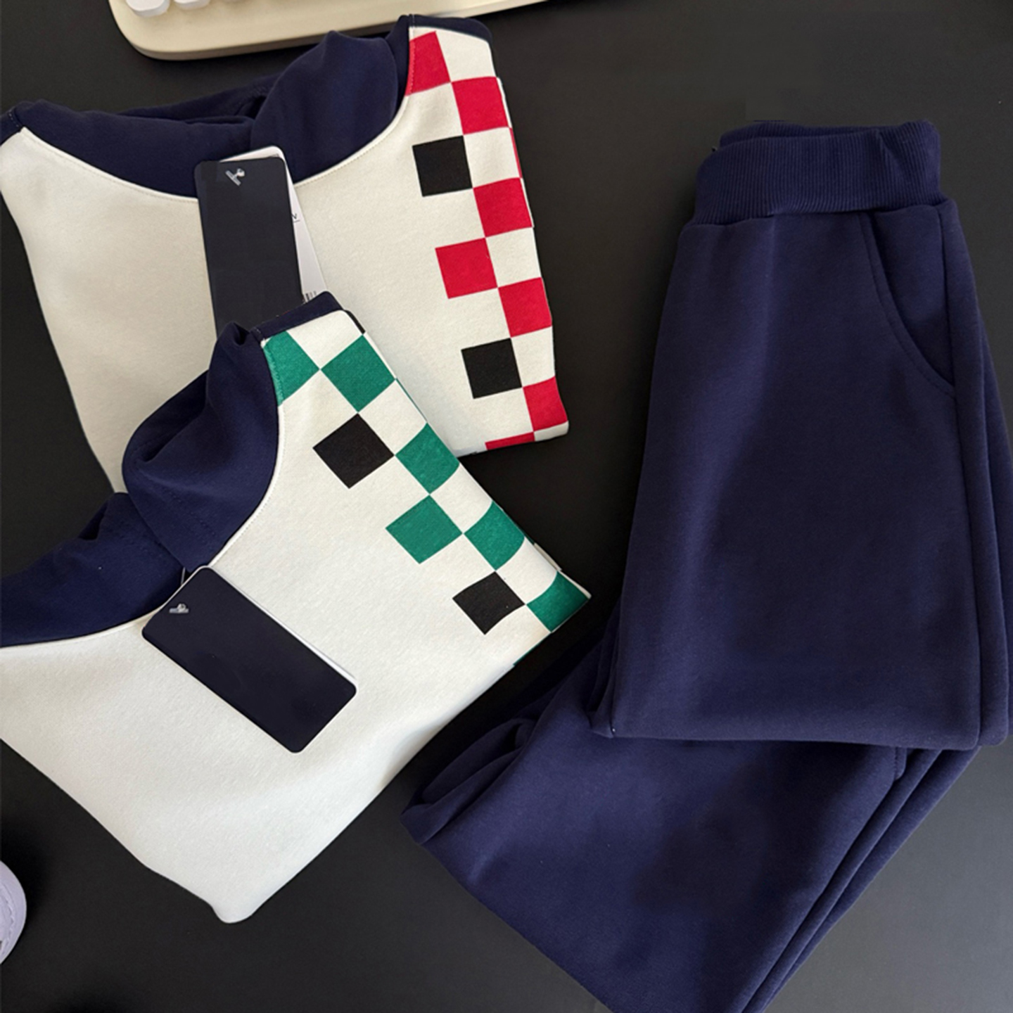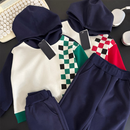 儿童套装秋季男女童F款棋盘格子印花休闲百搭连帽卫衣卫裤套装