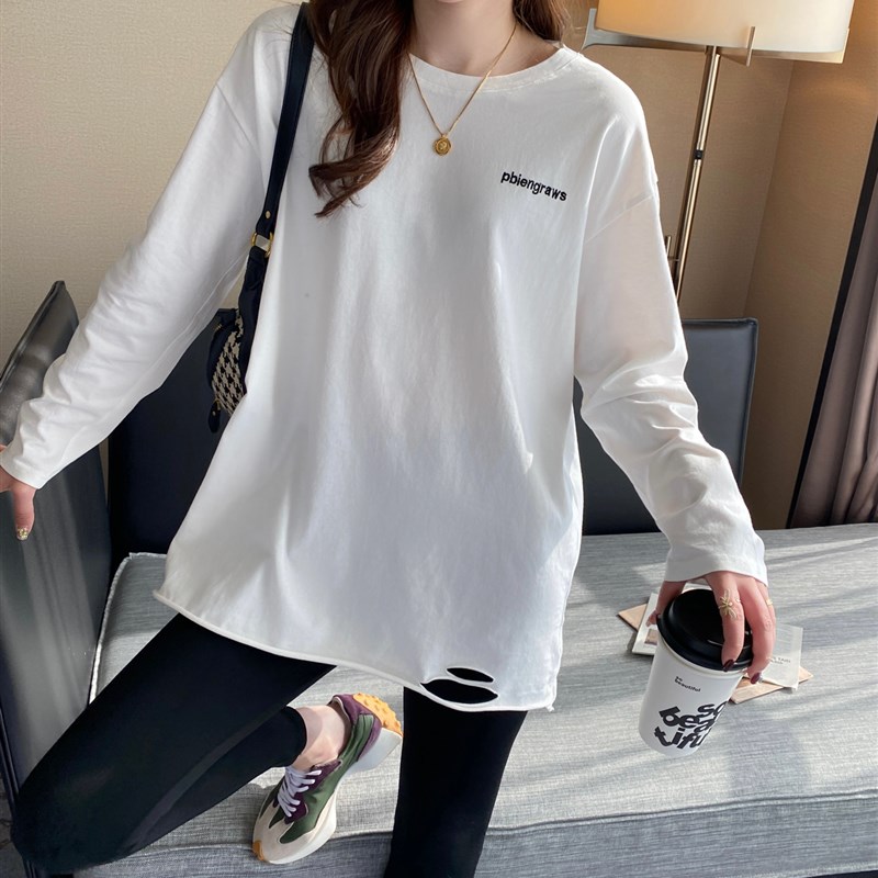 白色长袖t恤女秋冬中长款打底衫内搭2021年新款破洞纯棉圆领上衣