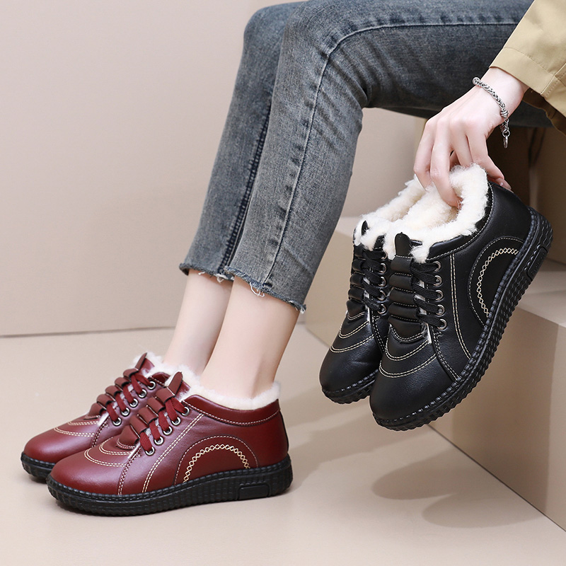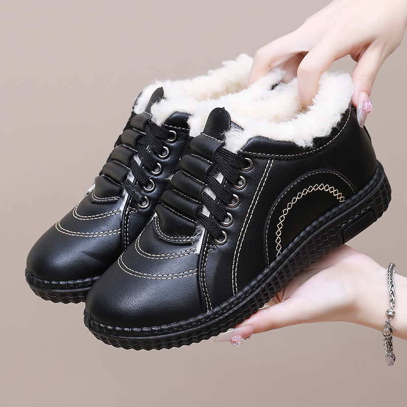 冬季新款雪地靴棉鞋女加绒加厚绵羊毛妈妈鞋皮面防水老北京女棉靴