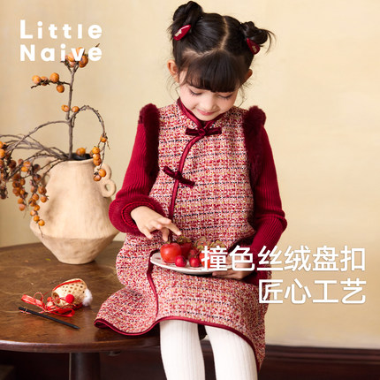 LittleNaive儿童粗花呢旗袍加绒国风连衣裙冬女童过年红色背心裙
