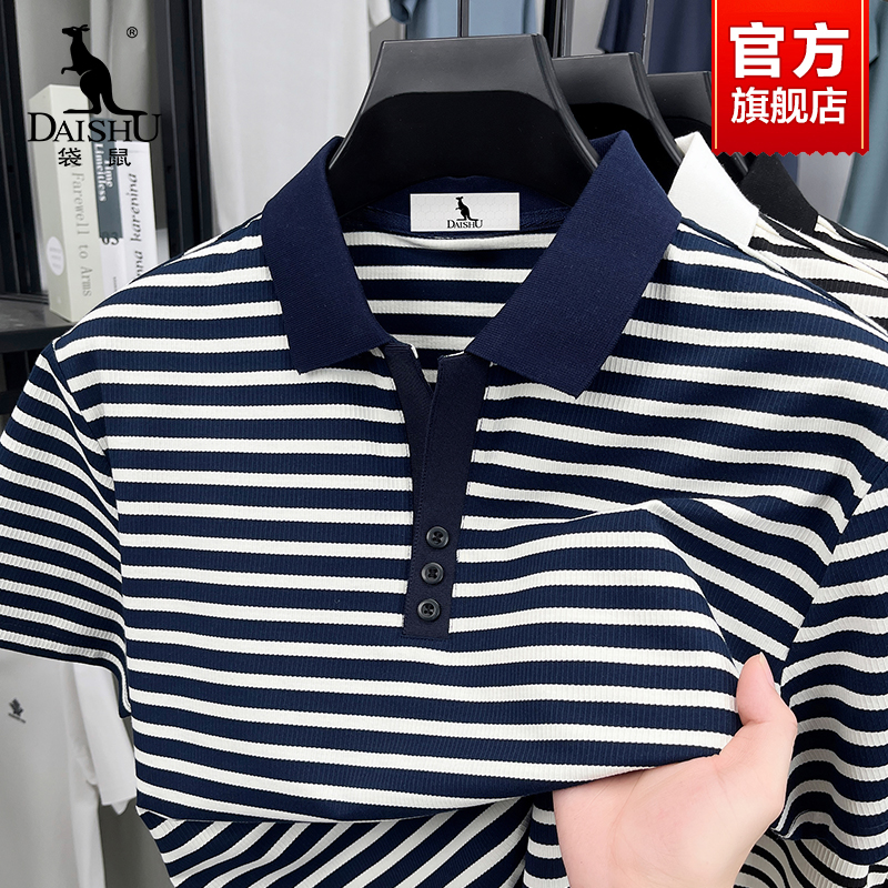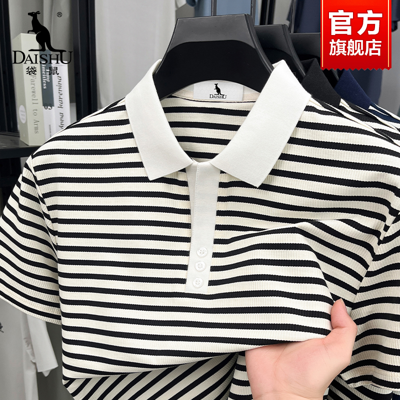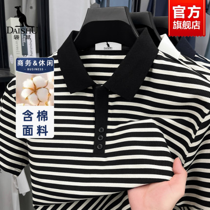 袋鼠男士POLO衫2025年夏季新款宽松透气半袖时尚条纹翻领短袖t恤