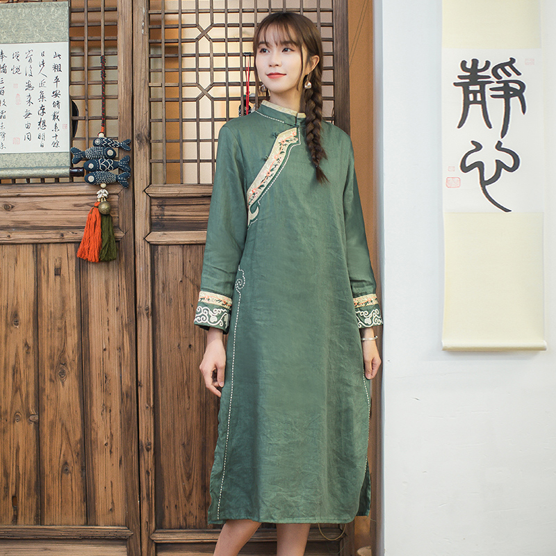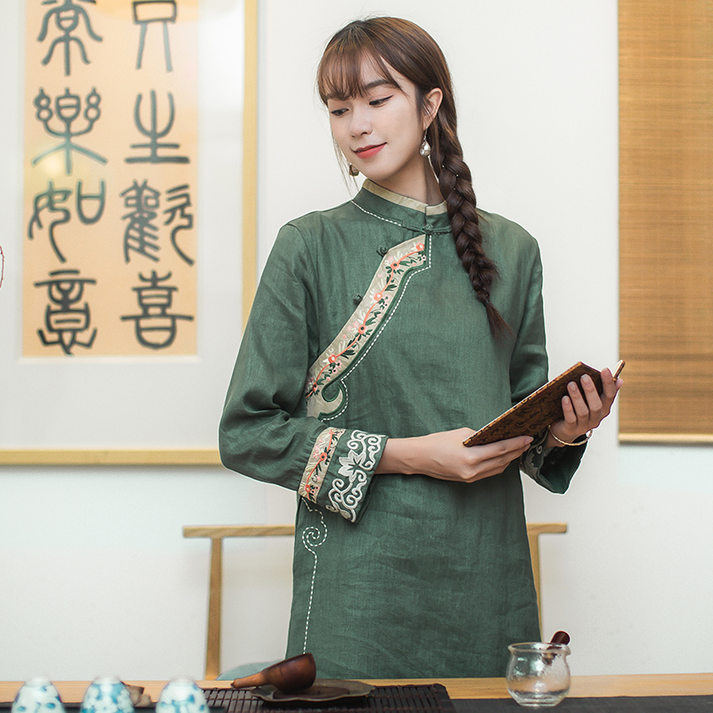 【双层亚麻连衣裙】远镇民族风刺绣女棉麻茶服女装中国风复古棉袄