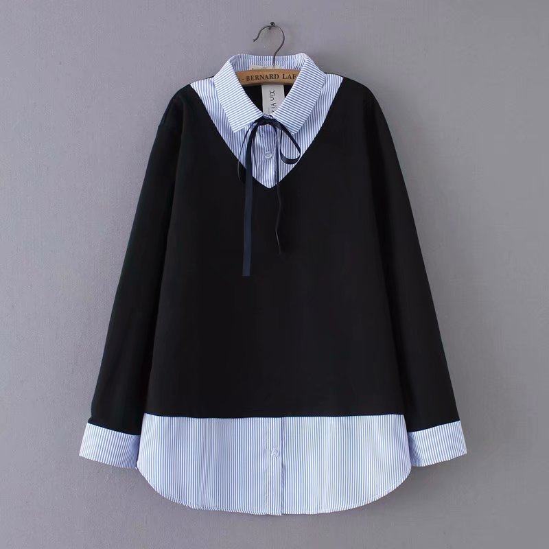 大码女装2023春季新款加大码胖MM韩版条纹丝带假两件打底衬衫