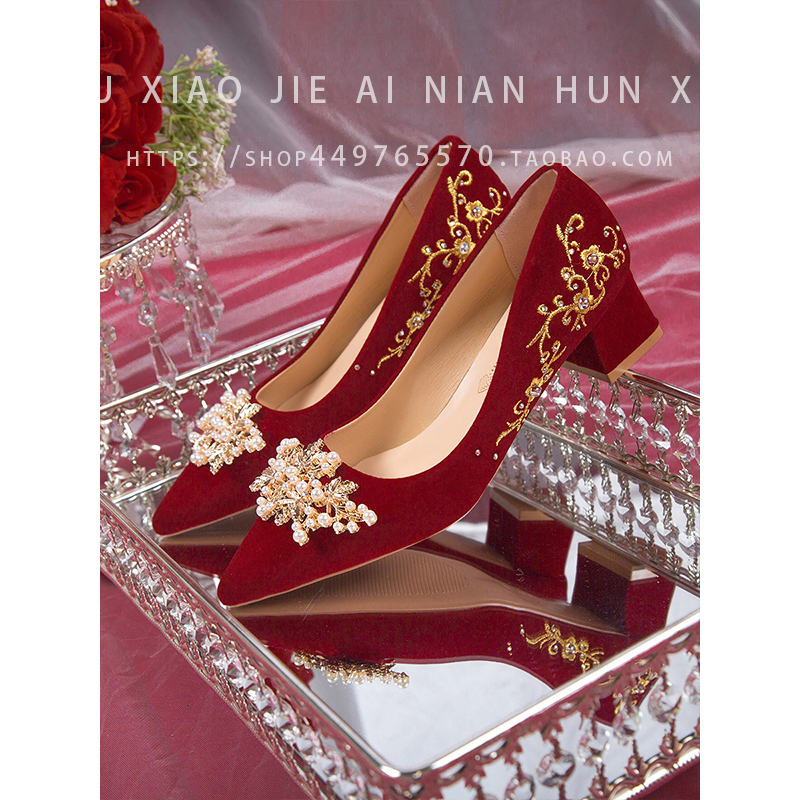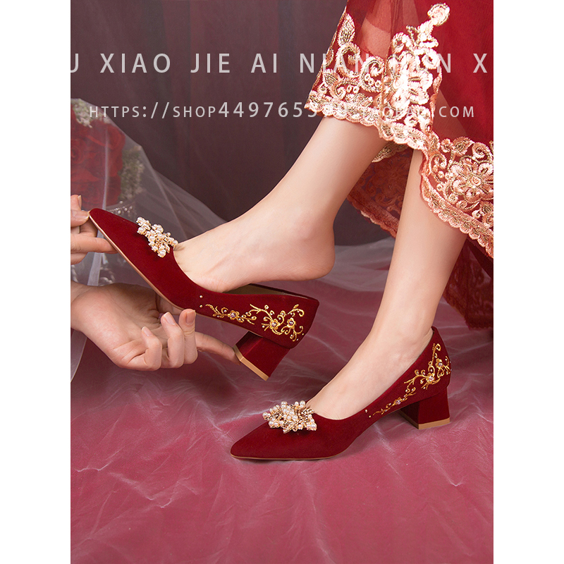 真皮婚鞋新娘鞋秀禾婚纱两穿2025年新款中式红色尖头高跟鞋女孕妇