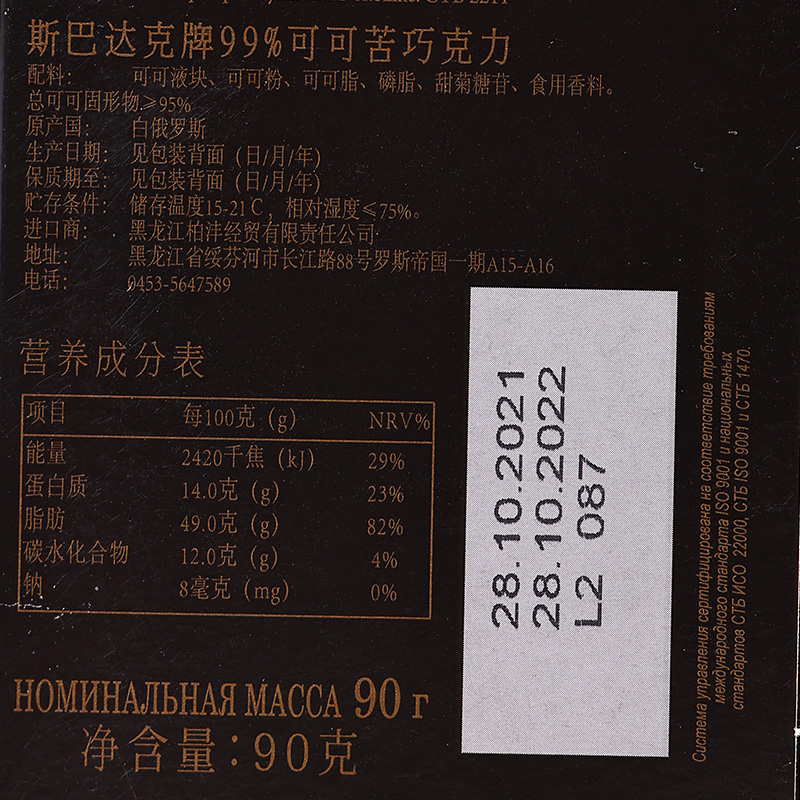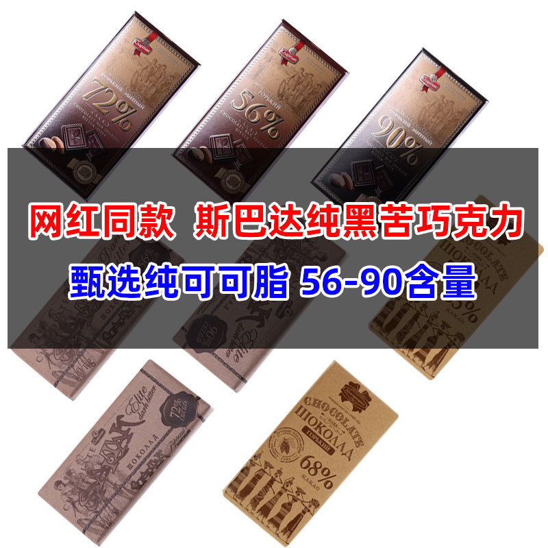 纯可可脂白俄罗斯黑巧克力原装进口90%健身苦黑网红小零食斯巴达