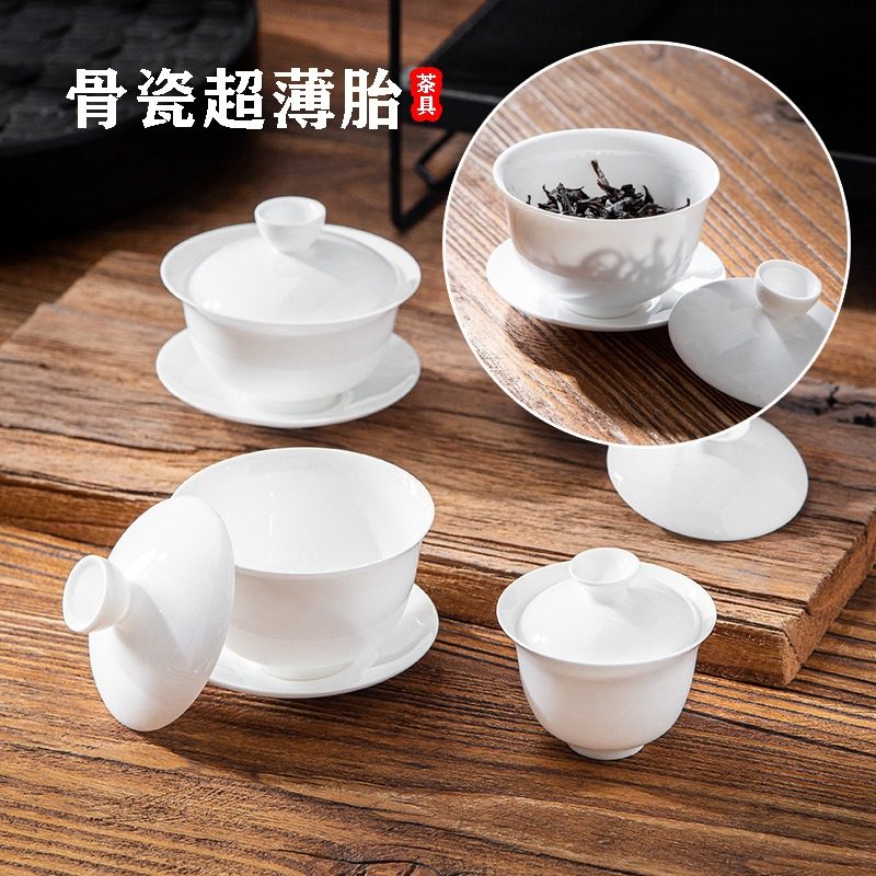 潮州超薄胎骨瓷三才杯盖碗茶杯白瓷功夫茶具礼盒套装家用主人茶杯