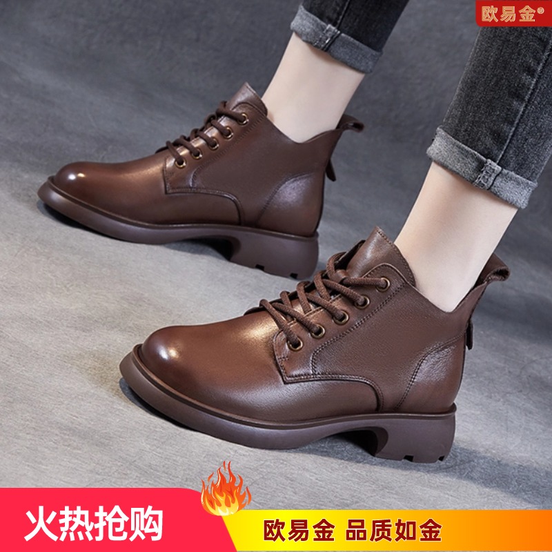 欧易金新款真皮英伦马丁靴女鞋子瘦瘦靴女靴V口系带全牛皮短靴子