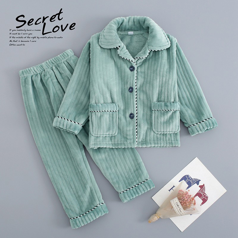 秋冬儿童法兰绒睡衣男童女童休闲加厚家居服亲子中大童卡通套装蓝