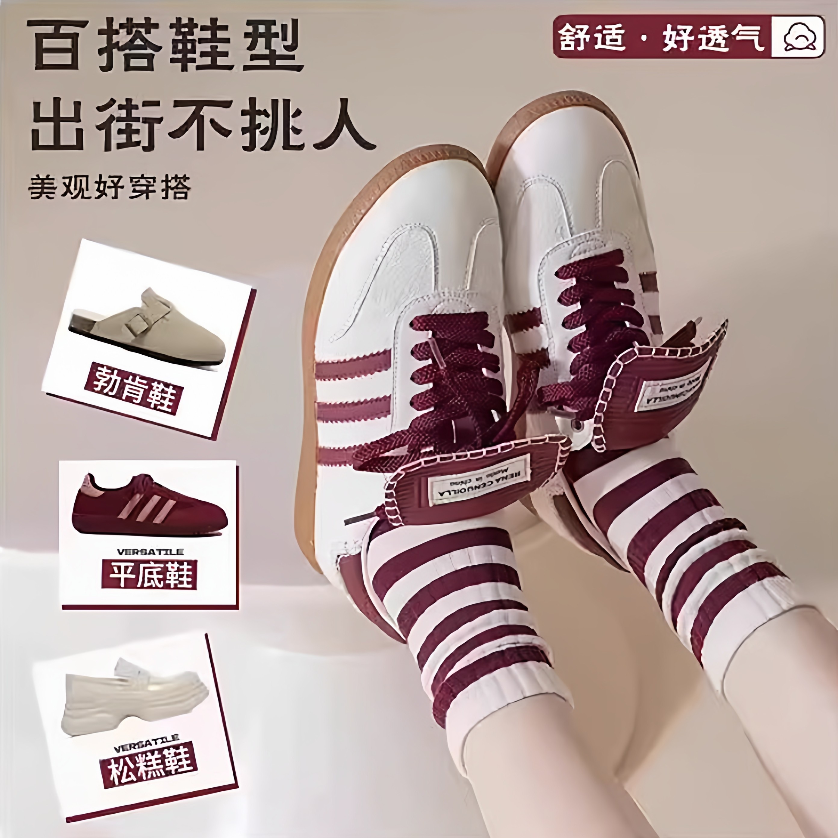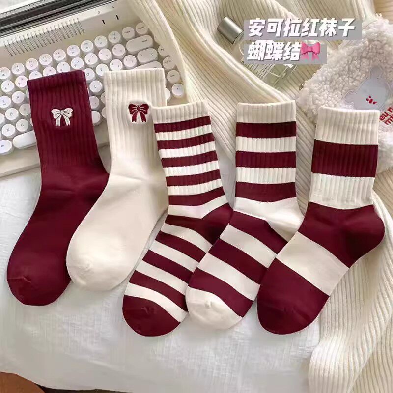 推荐~本命年红袜子复古安可拉女士中筒秋冬蝴蝶结条纹个性酒红色