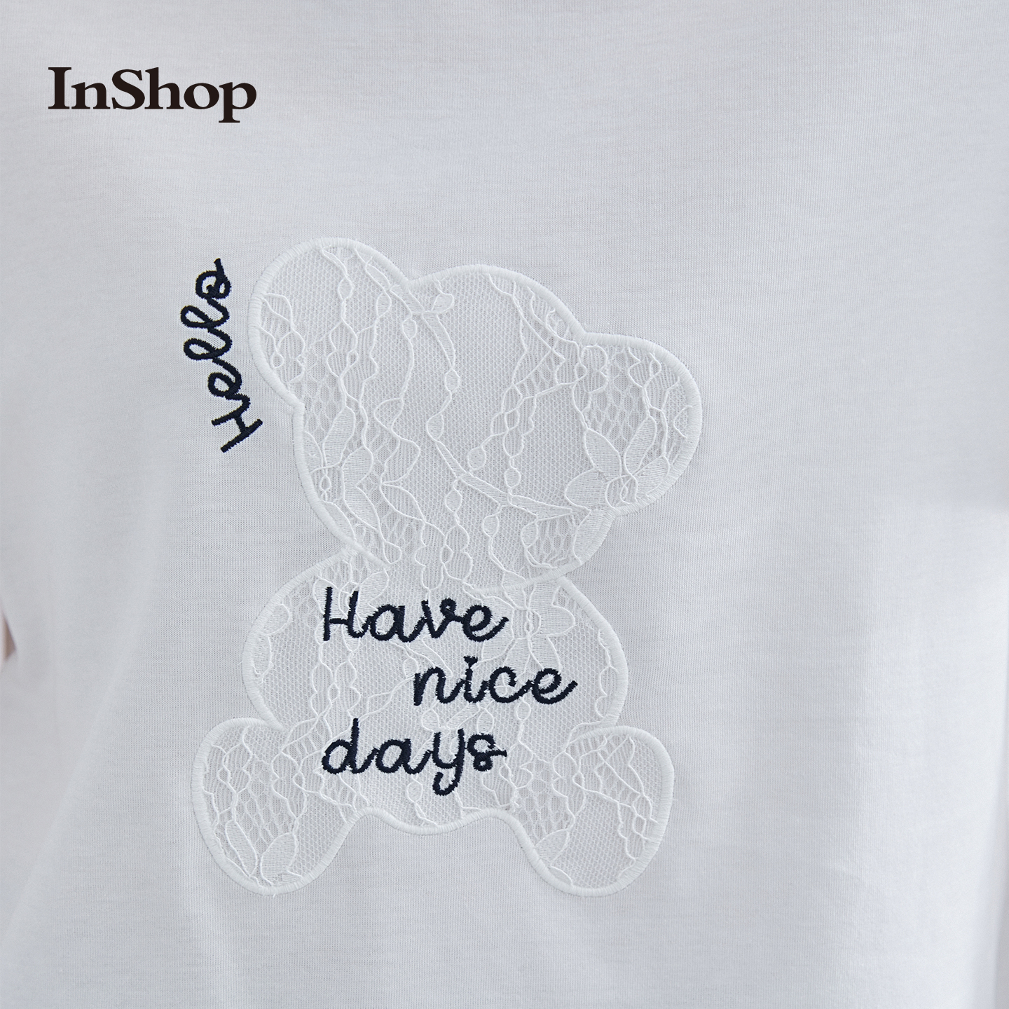 【商场同款】INSHOP新款少女感蕾丝小熊短袖t恤女宽松圆领上衣