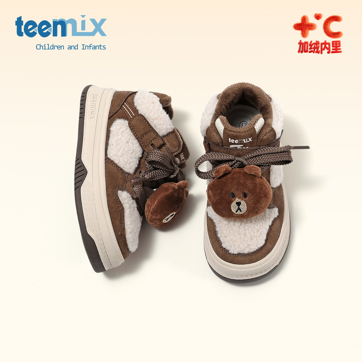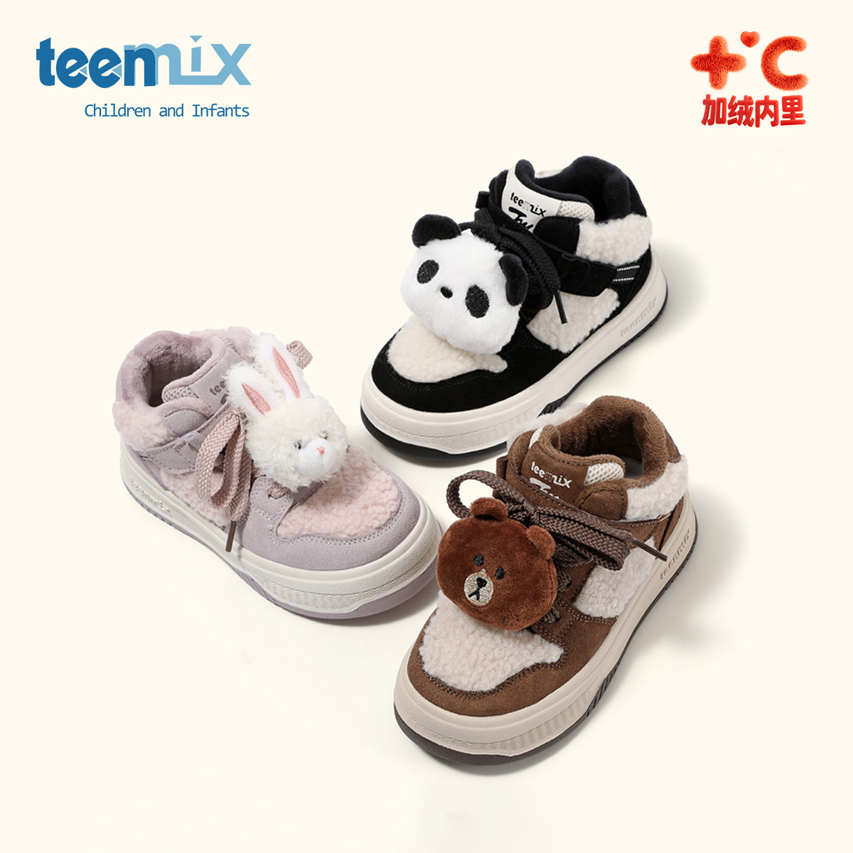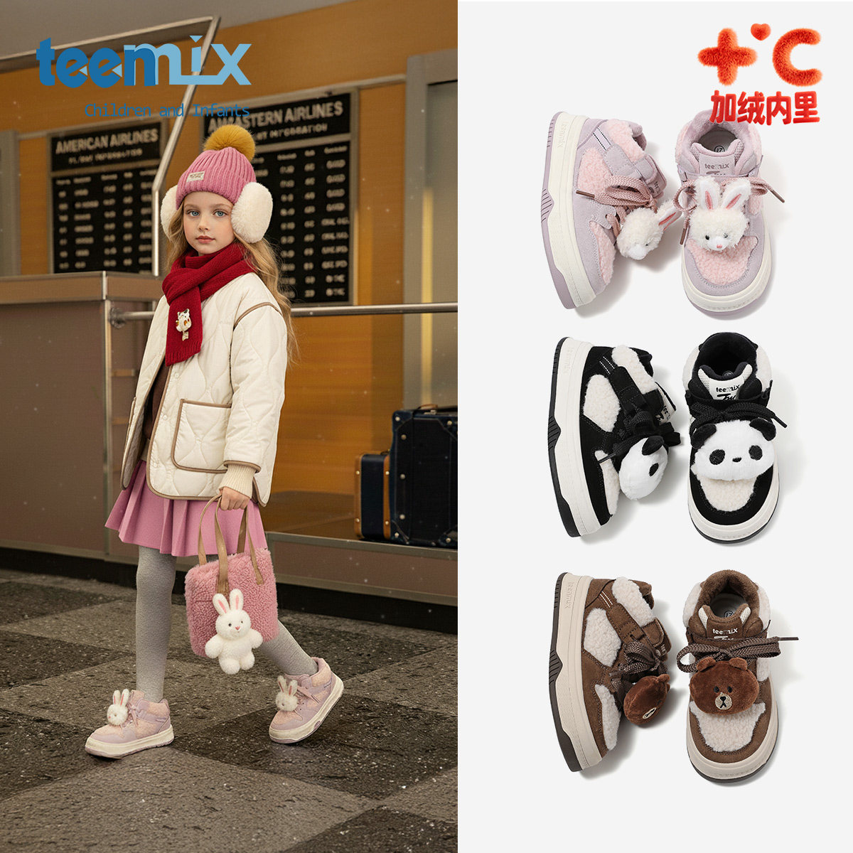 天美意儿童棉鞋2025冬季新款女童加绒兔子玩偶板鞋男童二棉休闲鞋